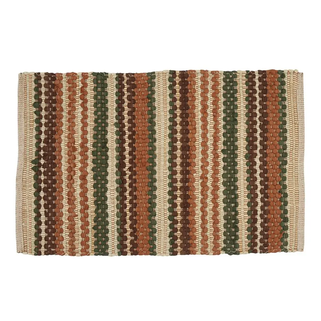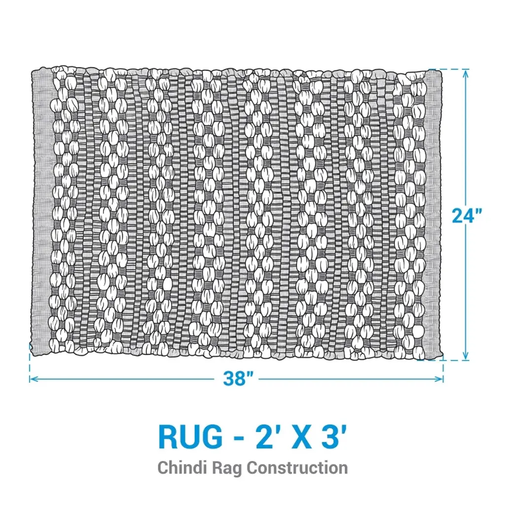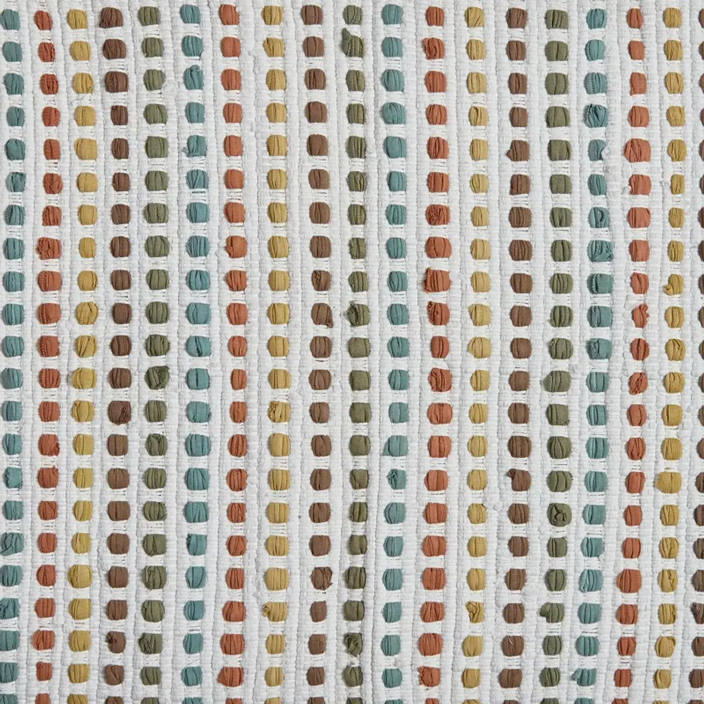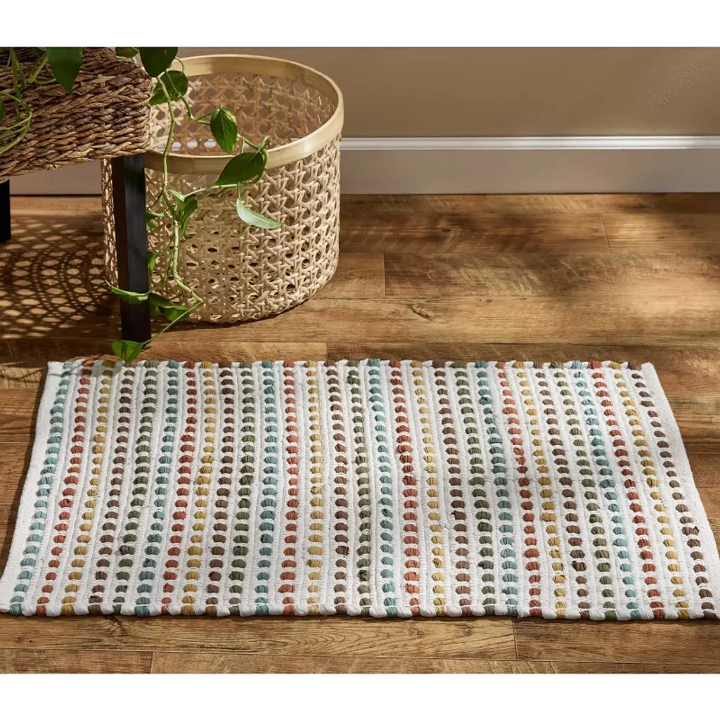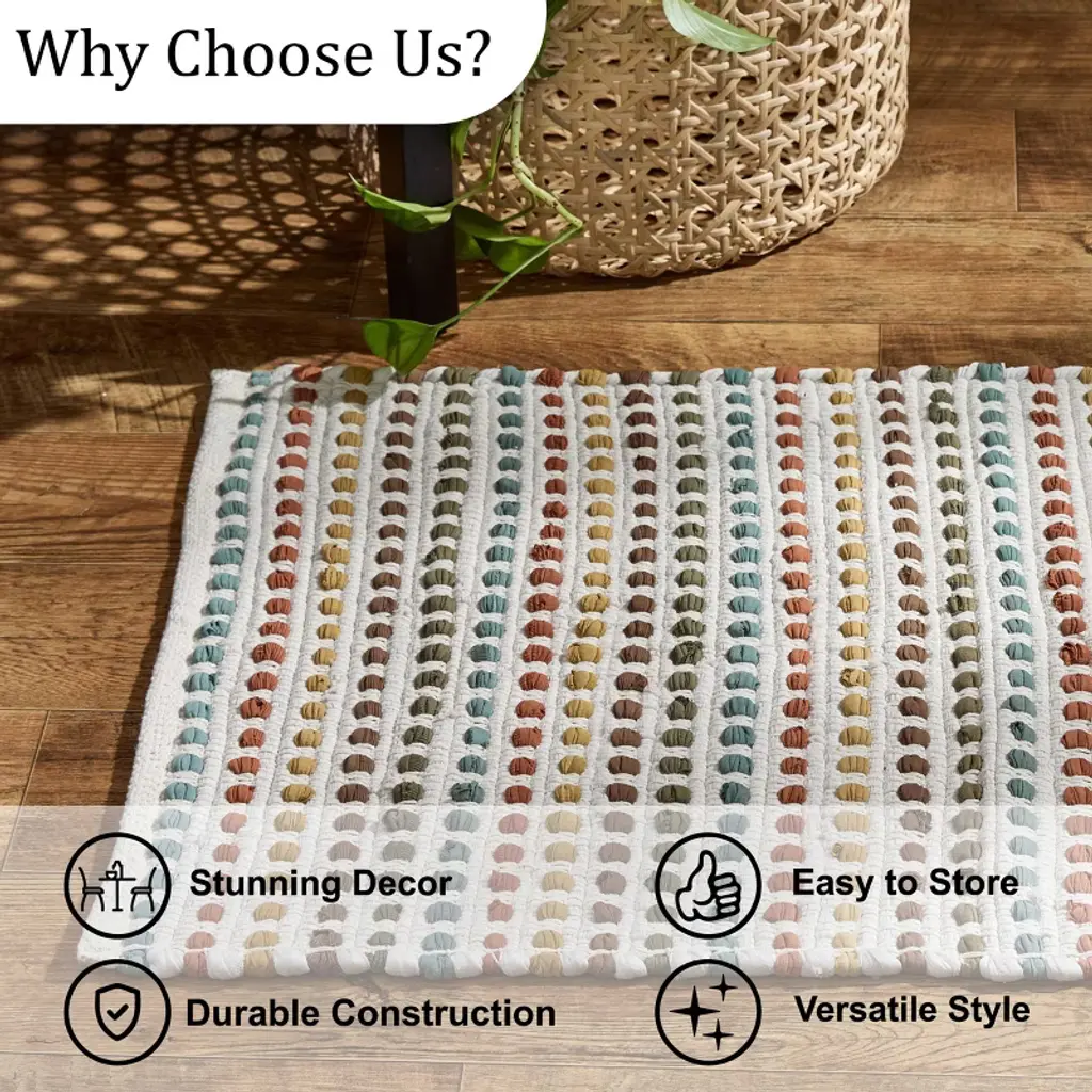 Adding unique interest and dimension, this textured indoor rug will become a statement flooring accessory that won't go out of style. Intricately woven with a combination of alternating olive green, honey yellow, rustic orange, and slate blue chindi cotton blend cloths charmingly highlighted against the white base construction. This earthy color palette introduces an iconic and vintage aesthetic to perfectly complement midcentury modern, groovy eclectic, and retro boho home decorations. Place in front of an accent chair or small sofa to define a reading nook, or as a charming accessory to position in an interior entryway space.