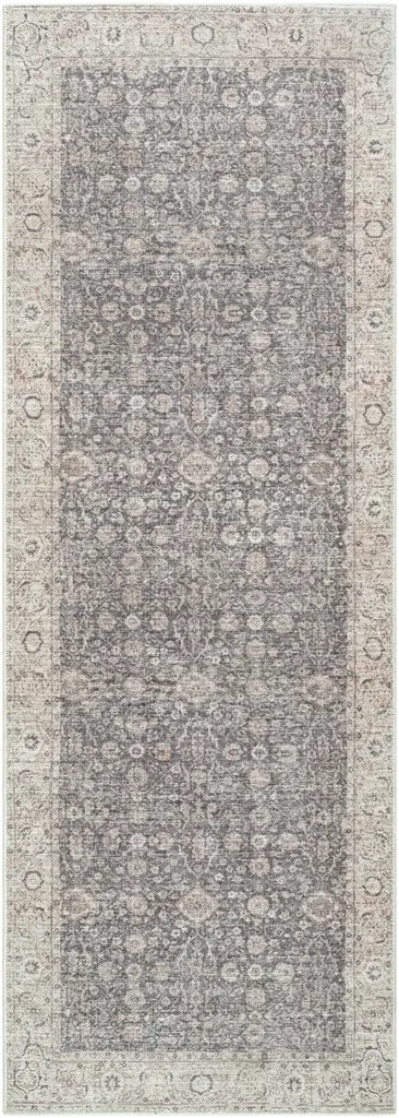 Collection: Bronia Colors: Charcoal, Ivory, Tan Construction: Machine Woven Material: 100% Polyester Pile: Medium Pile Pile Height: 0.24" Styles: Traditional Made In: Turkey Thickness: 0.39" Price Range: $$$$$ (Affordable)