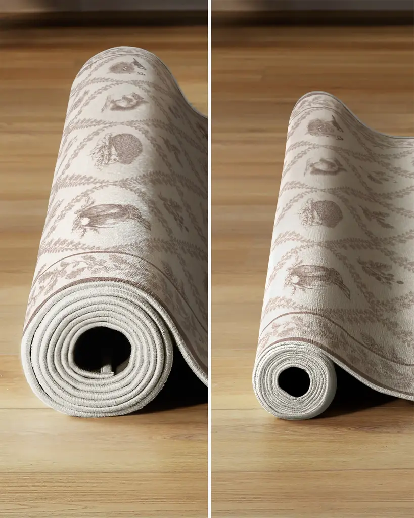Feel the charm of the woodland with our Sanderson Squirrel & Hedgehog Fawn Rug. Referencing the Squirrel & Hedgehog design by Sanderson, this rug features delicate linework drawings of beloved British wildlife: a squirrel, rabbit, and hedgehog, accompanied by natural British flora, including acorns, catkins, and blackberries. These motifs are beautifully arranged within a lattice structure, framed by a floral border that complements the flora in the design. A soft palette of taupes is set against a warm vanilla background. Water-resistant, stain-resistant, and machine-washable. Rug colors may vary slightly according to your device and the lighting in your space.