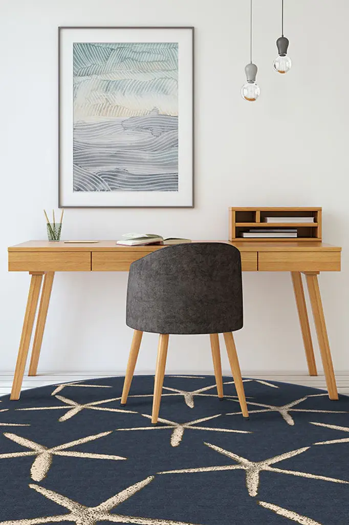 Accentuate the style of your home's interior with our Starfish Navy rug. Its stunning sea-inspired design features a galaxy of taupe sea stars floating in an ocean of navy and light slate blue colors. This stunning floor decor piece is the perfect accent to bring nautical charm to your coastal, contemporary or modern home's interior design.