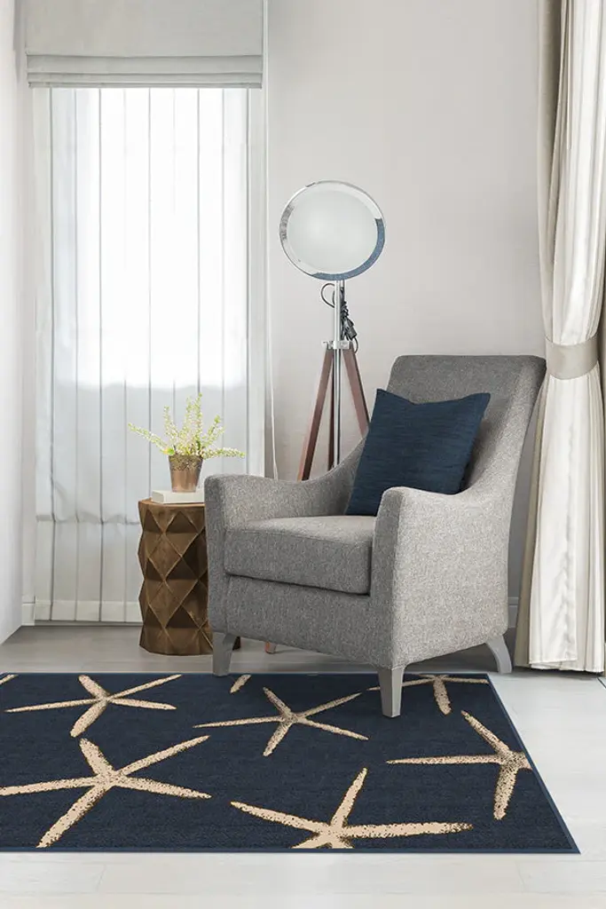 Accentuate the style of your home's interior with our Starfish Navy rug. Its stunning sea-inspired design features a galaxy of taupe sea stars floating in an ocean of navy and light slate blue colors. This stunning floor decor piece is the perfect accent to bring nautical charm to your coastal, contemporary or modern home's interior design.