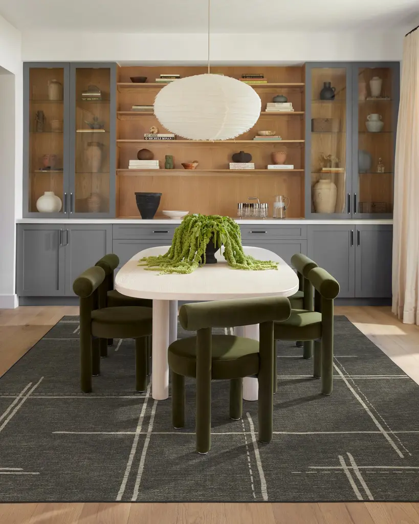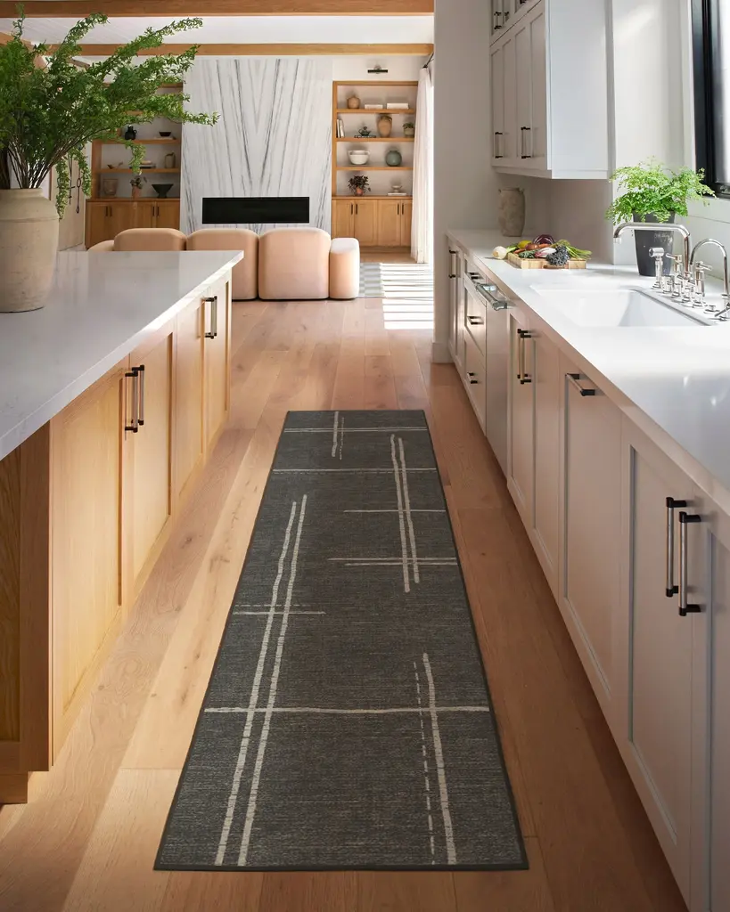 Create a warm and welcoming home with our Stellan Charcoal Rug. Featuring hand-drawn asymmetrical grid lines, this modern and muted design uses soft cream linework against a deep-layered charcoal background to establish its warm vibe. Water-resistant, stain-resistant, and machine-washable. Rug colors may vary slightly according to your device and the lighting in your space.