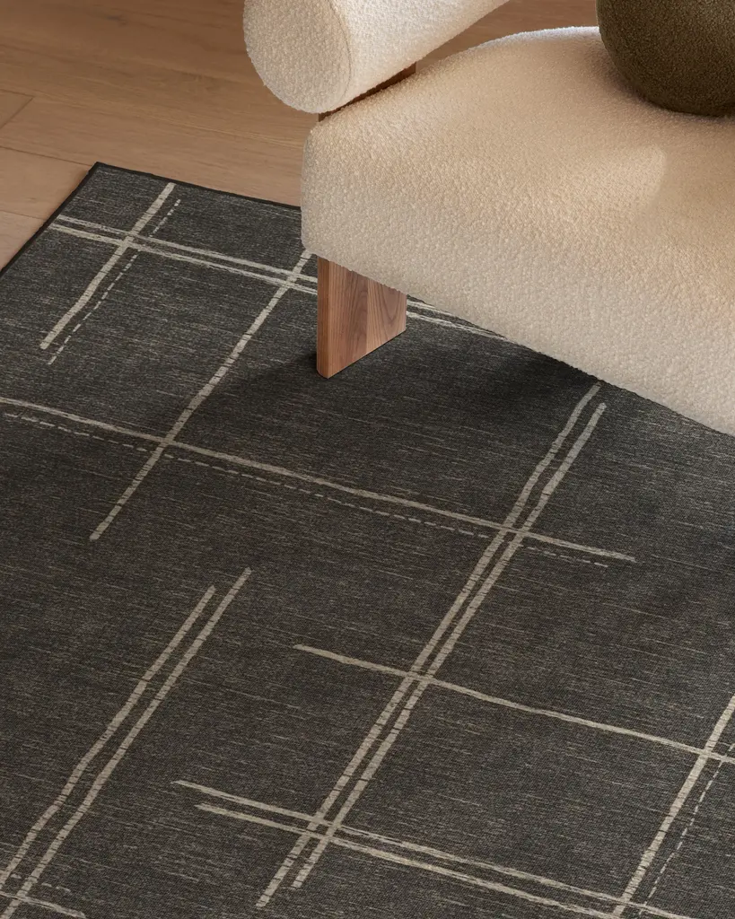 Create a warm and welcoming home with our Stellan Charcoal Rug. Featuring hand-drawn asymmetrical grid lines, this modern and muted design uses soft cream linework against a deep-layered charcoal background to establish its warm vibe. Water-resistant, stain-resistant, and machine-washable. Rug colors may vary slightly according to your device and the lighting in your space.