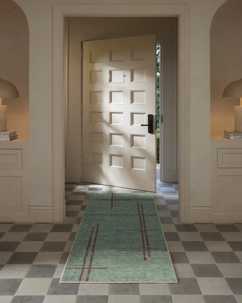 Featuring hand-drawn grid lines in a muted palette, our Stellan Sage Rug blends cherry wood brown linework against a sage green background. Water-resistant, stain-resistant, and machine-washable. Rug colors may vary slightly according to your device and the lighting in your space.