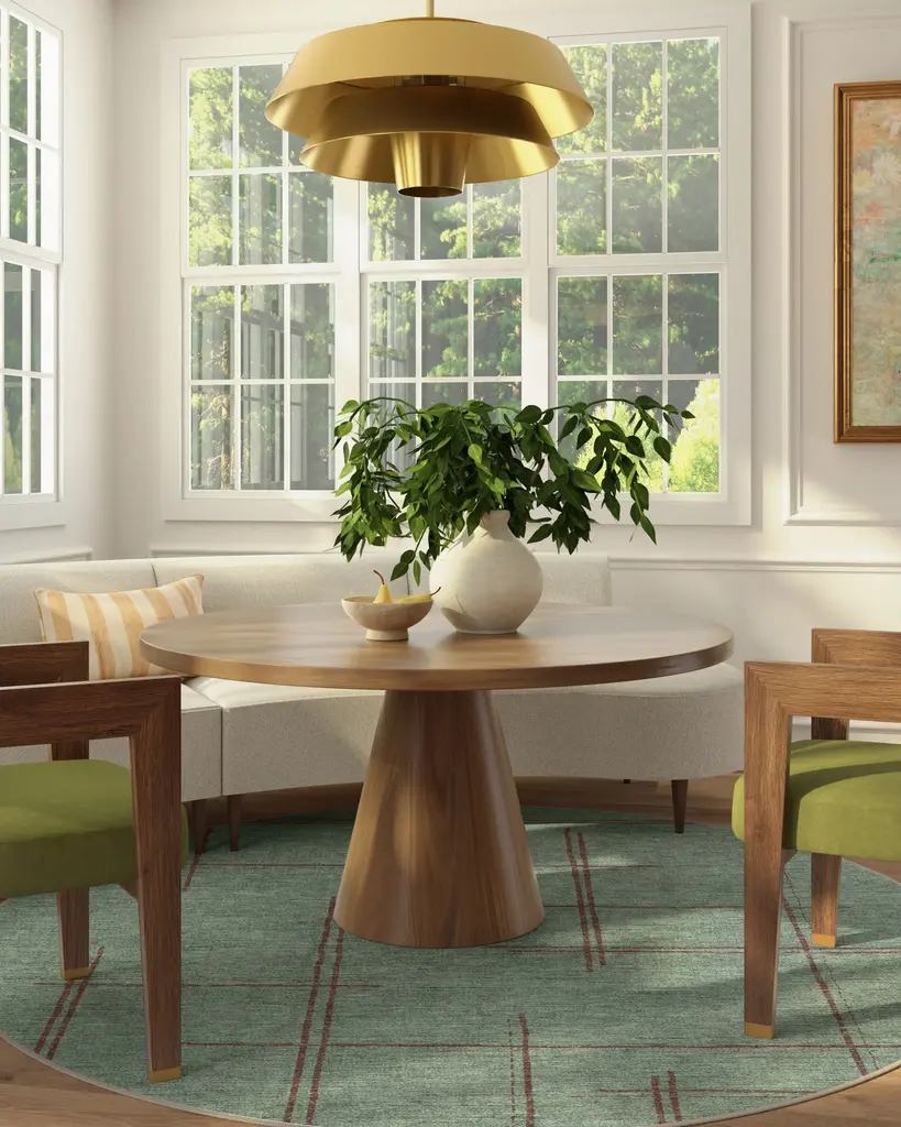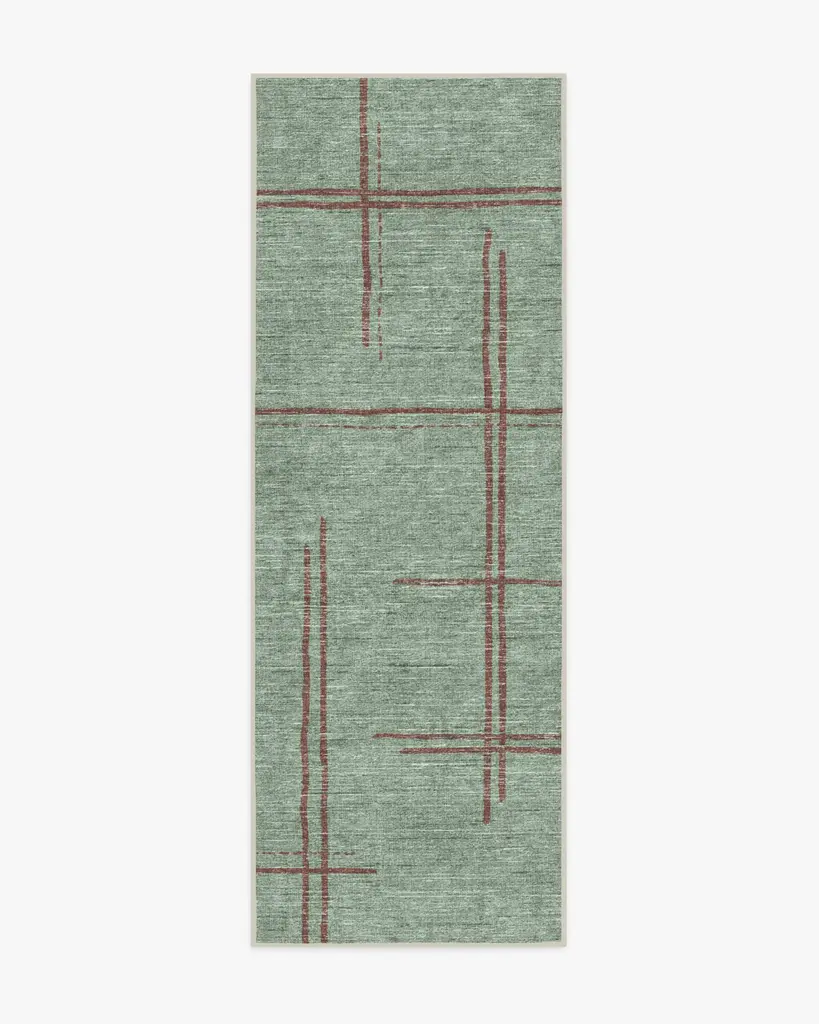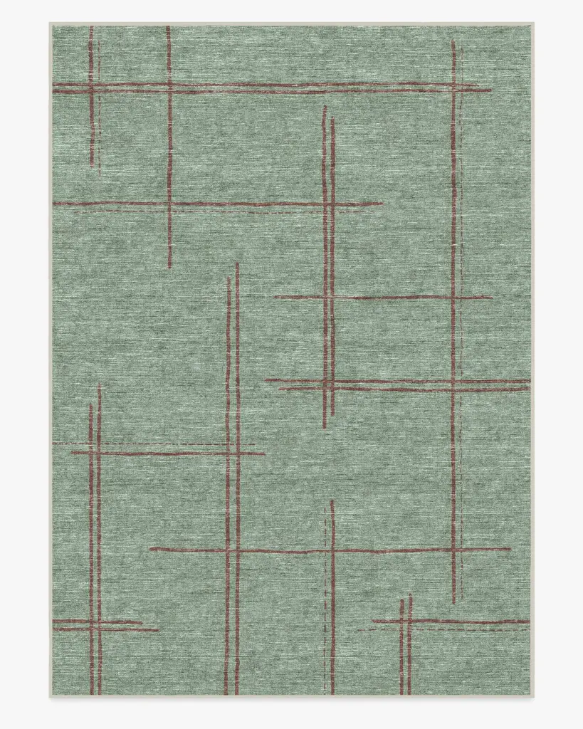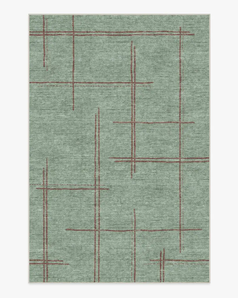 Featuring hand-drawn grid lines in a muted palette, our Stellan Sage Rug blends cherry wood brown linework against a sage green background. Water-resistant, stain-resistant, and machine-washable. Rug colors may vary slightly according to your device and the lighting in your space.