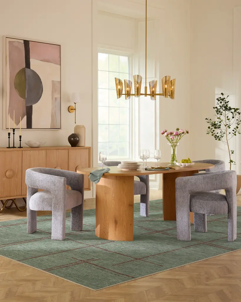 Featuring hand-drawn grid lines in a muted palette, our Stellan Sage Rug blends cherry wood brown linework against a sage green background. Water-resistant, stain-resistant, and machine-washable. Rug colors may vary slightly according to your device and the lighting in your space.