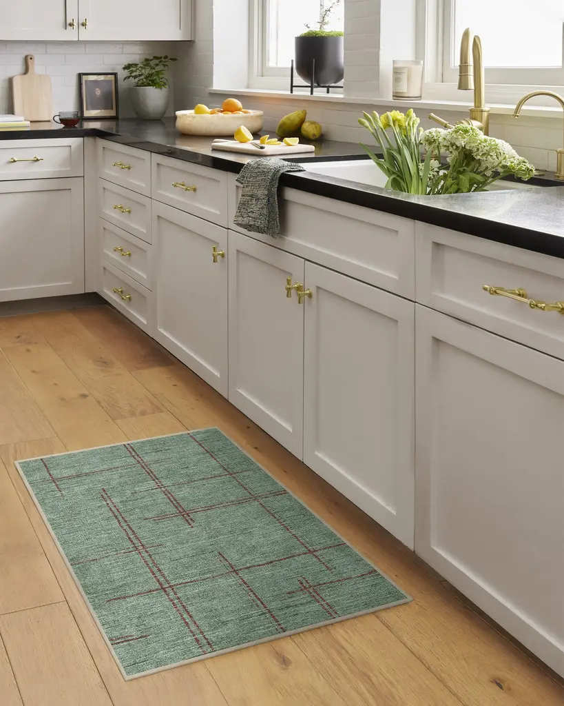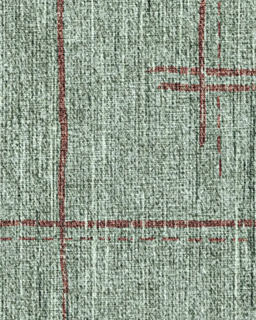 Featuring hand-drawn grid lines in a muted palette, our Stellan Sage Rug blends cherry wood brown linework against a sage green background. Water-resistant, stain-resistant, and machine-washable. Rug colors may vary slightly according to your device and the lighting in your space.