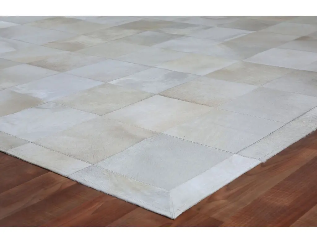 Rich squares of cowhide are artfully composed in a tone-on-tone checkered pattern on this ivory rug. Due to the inherent natural beauty and unique character of the cowhide, the appearance of each rug may vary. A rug pad is recommended to keep this securely in place and provide an extra layer of cushioning.