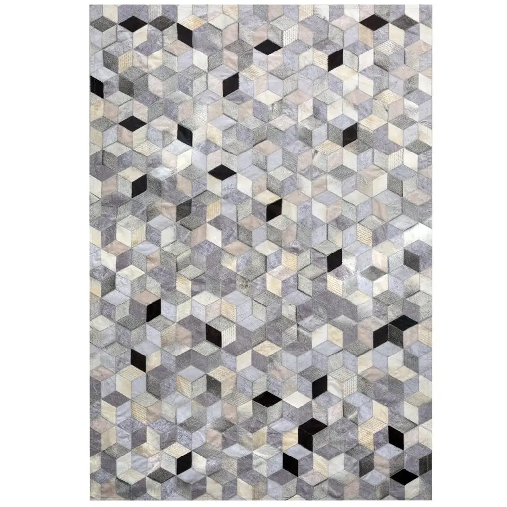 Rich squares of cowhide are artfully composed in a tone-on-tone geometric pattern on this silver rug. Due to the inherent natural beauty and unique character of the cowhide, the appearance of each rug may vary. A rug pad is recommended to keep this securely in place.