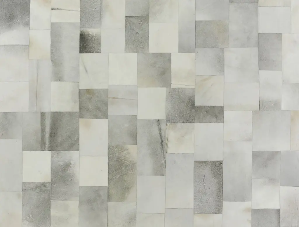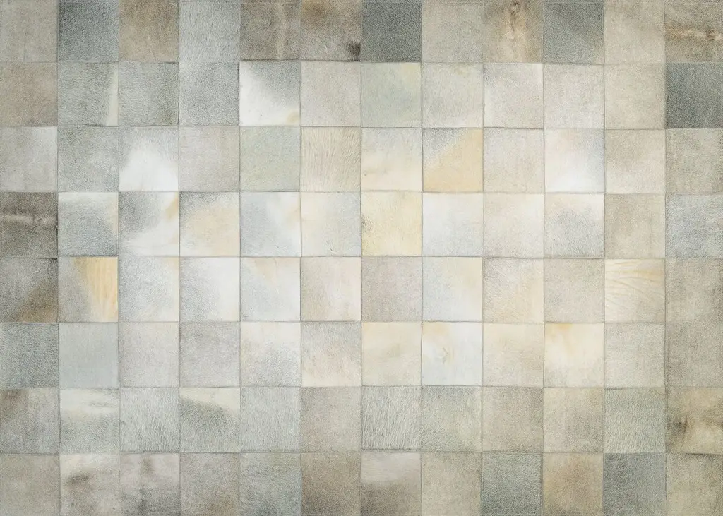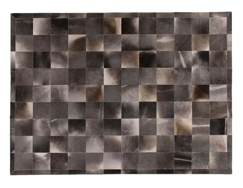 Squares of cowhide are artfully composed in a subtle tone-on-tone checkered pattern on this cool silver rug. Due to the inherent natural beauty and unique character of the cowhide, the appearance of each rug may vary. A rug pad is recommended to keep this securely in place.