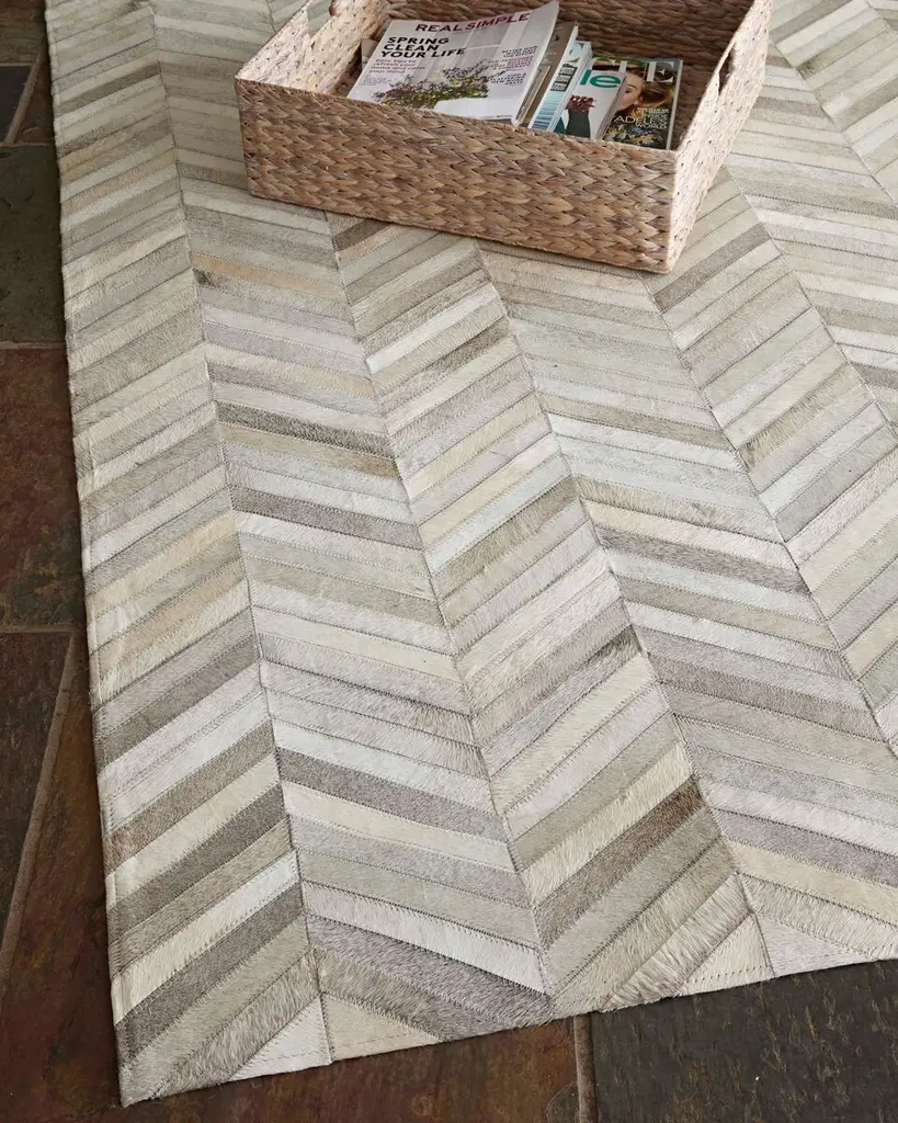 A fresh take on a classic herringbone pattern, this rug is handmade of cowhide, giving it unique texture and subtle shifts in color. Due to the inherent natural beauty and unique character of the cowhide, the appearance of each rug may vary. A rug pad is recommended to keep this securely in place and provide an extra layer of cushioning.