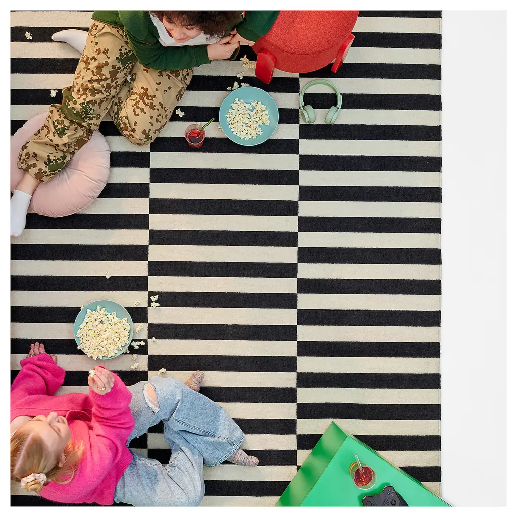 STOCKHOLM Rug, flatwoven - handmade/stripe black/off-white 5 ' 7 "x7 ' 10 ". Handwoven by skilled craftspeople, each one is unique. Made in India in organized weaving centers with good working conditions and fair wages. Easy to vacuum thanks to its flat surface. The rug is hand-woven.