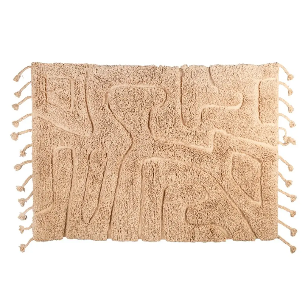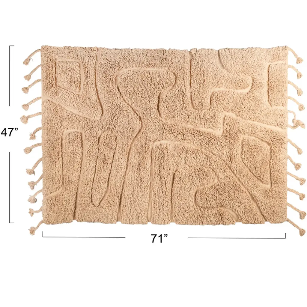 This Tactile Elegance Hand-Woven Rug is a masterpiece of craftsmanship and design. Measuring a generous 71 by 47 inches, it features a plush 1-inch pile height and 6-inch long braided tassels that add a playful touch to its edges. The natural hues of the wool and cotton blend weave a story of comfort and style. Experience the rug's softness underfoot while relaxing in any living space. Its organic shape and varying pile heights create a dynamic visual and tactile experience, making it a focal point in any room. Designed for those who appreciate the finer details, this rug is a testament to the beauty of handcrafted artistry.