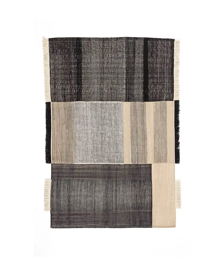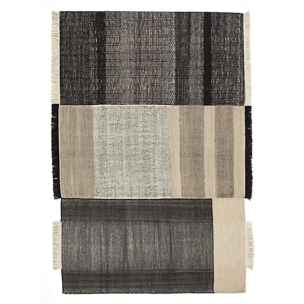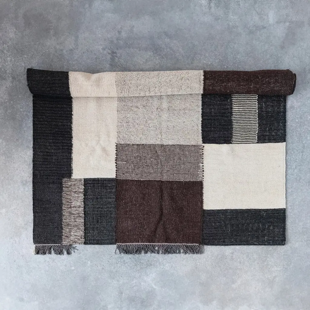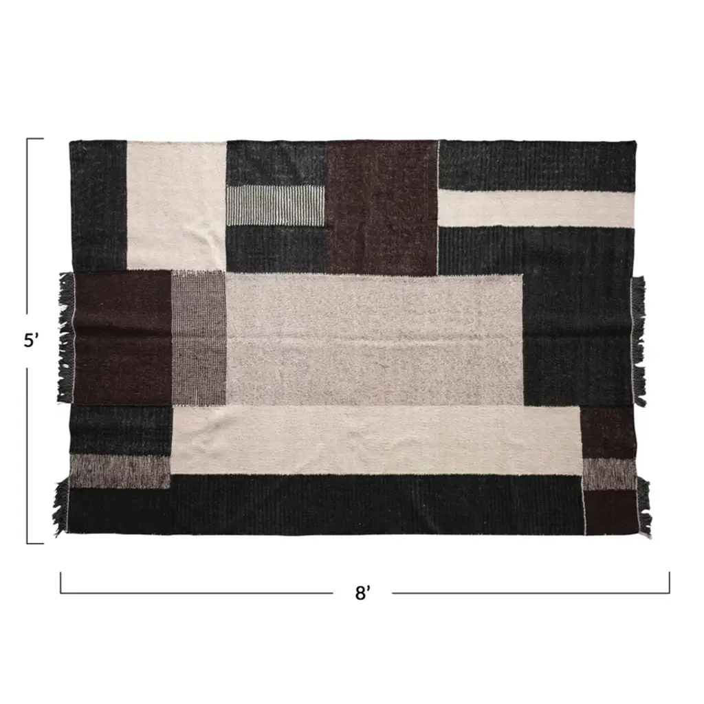 Black, brown, and white woven cotton rug with geometric design and fringe; Dry clean only; Made from wool and cotton; Rug measures 96" L x 60" W x 0" H