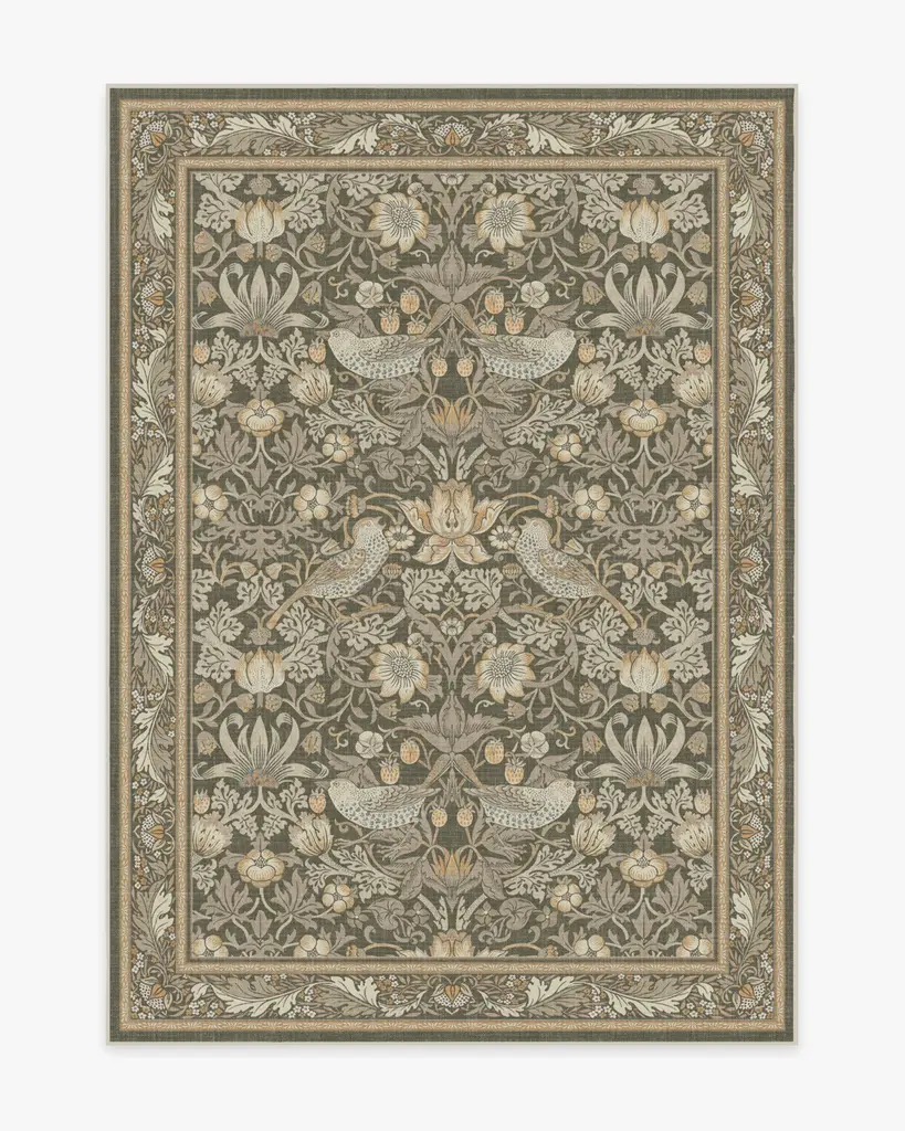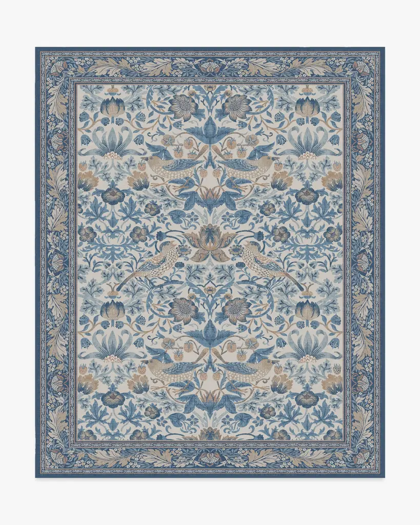 Step into Kelmscott Manor's garden with the Morris & Co. Strawberry Thief Indigo & Ivory Rug. A direct translation of William Morris's recognizable block print textile, this rug depicts Morris's thrushes stealing fruit from his kitchen garden. A classic blue and white recolor of the original design, this colorway balances warm and cool tones with indigo, delft, and dusty blues complementing taupe, ivory, and beige accents, for traditional grandeur. Water-resistant, stain-resistant, and machine-washable. Rug colors may vary slightly according to your device and the lighting in your space.