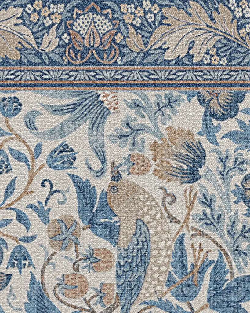 Step into Kelmscott Manor's garden with the Morris & Co. Strawberry Thief Indigo & Ivory Rug. A direct translation of William Morris's recognizable block print textile, this rug depicts Morris's thrushes stealing fruit from his kitchen garden. A classic blue and white recolor of the original design, this colorway balances warm and cool tones with indigo, delft, and dusty blues complementing taupe, ivory, and beige accents, for traditional grandeur. Water-resistant, stain-resistant, and machine-washable. Rug colors may vary slightly according to your device and the lighting in your space.