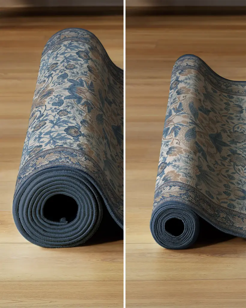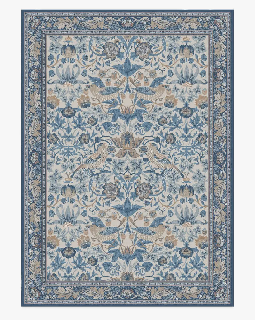 Step into Kelmscott Manor's garden with the Morris & Co. Strawberry Thief Indigo & Ivory Rug. A direct translation of William Morris's recognizable block print textile, this rug depicts Morris's thrushes stealing fruit from his kitchen garden. A classic blue and white recolor of the original design, this colorway balances warm and cool tones with indigo, delft, and dusty blues complementing taupe, ivory, and beige accents, for traditional grandeur. Water-resistant, stain-resistant, and machine-washable. Rug colors may vary slightly according to your device and the lighting in your space.