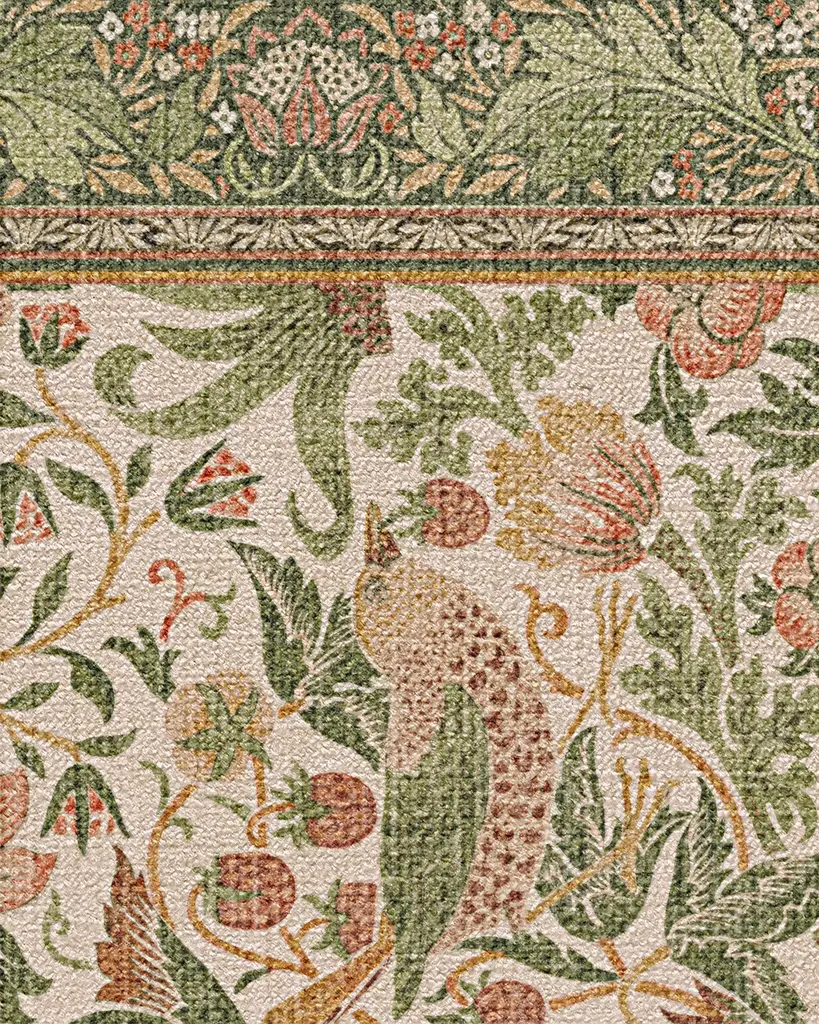 Step into Kelmscott Manor's garden with the Morris & Co. Strawberry Thief Sage & Rose Rug. A direct translation of William Morris's recognizable block print textile, this rug depicts Morris's thrushes stealing fruit from his kitchen garden. An earthy recolor of the original design, this colorway contrasts natural greens, floral pinks, and soft corals, leaving a grand impact. Water-resistant, stain-resistant, and machine-washable. Rug colors may vary slightly according to your device and the lighting in your space.