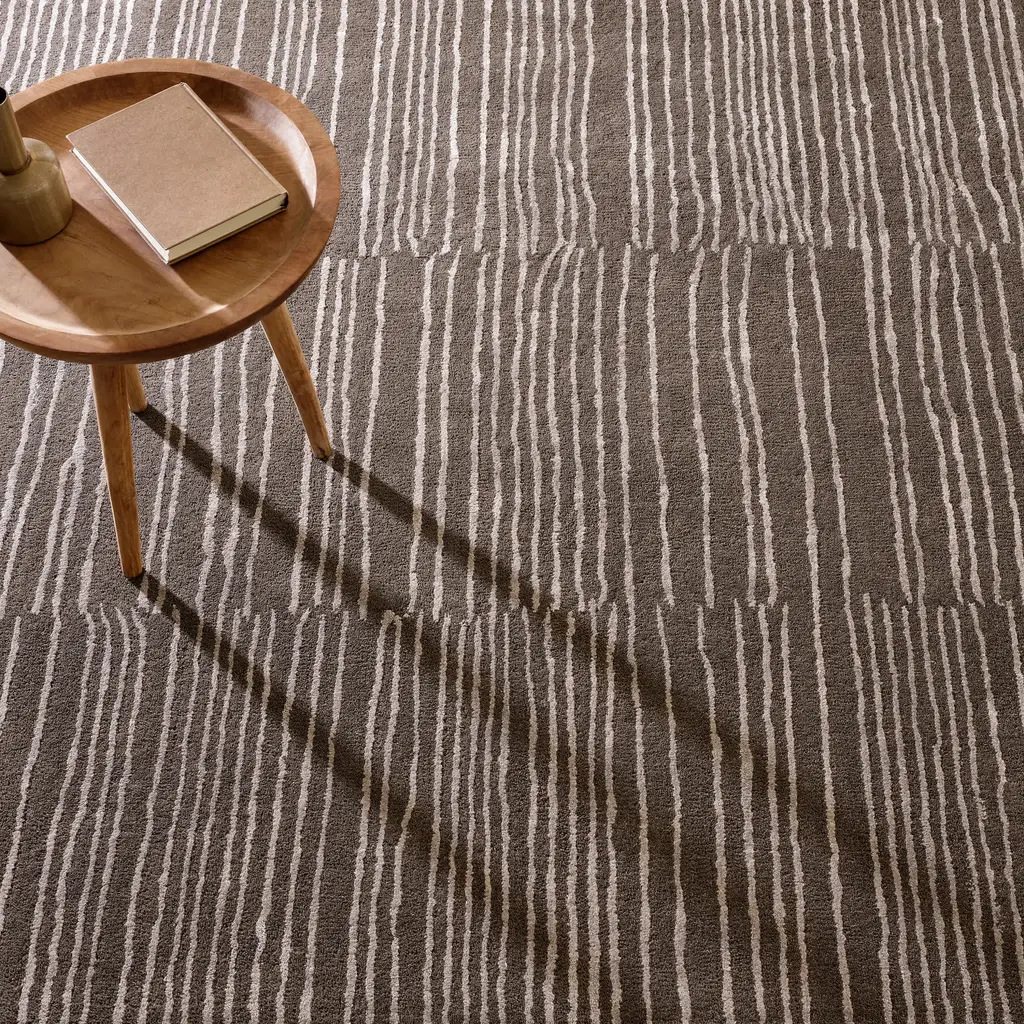Wide swaths of broken lines in bi-chromatic neutrals create rhythmic partitions across this sophisticated wool rug. A velvety sheared wool pile contrasts and enhances the finely observed sheen of the brindled bars in a softly toned mineral palette. Inspired by striated grooves in rock formations caused by the movement of glaciers, or newly erupting lava, pushing through cooling rock. A modern sensibility is expressed through traditional craftsmanship by Marie Flanigan, an award-winning interior designer. This luxurious wool rug is is a part of our design collaboration with Marie to produce a lifestyle collection that reflects her signature style of timeless elegance and innovative simplicity.