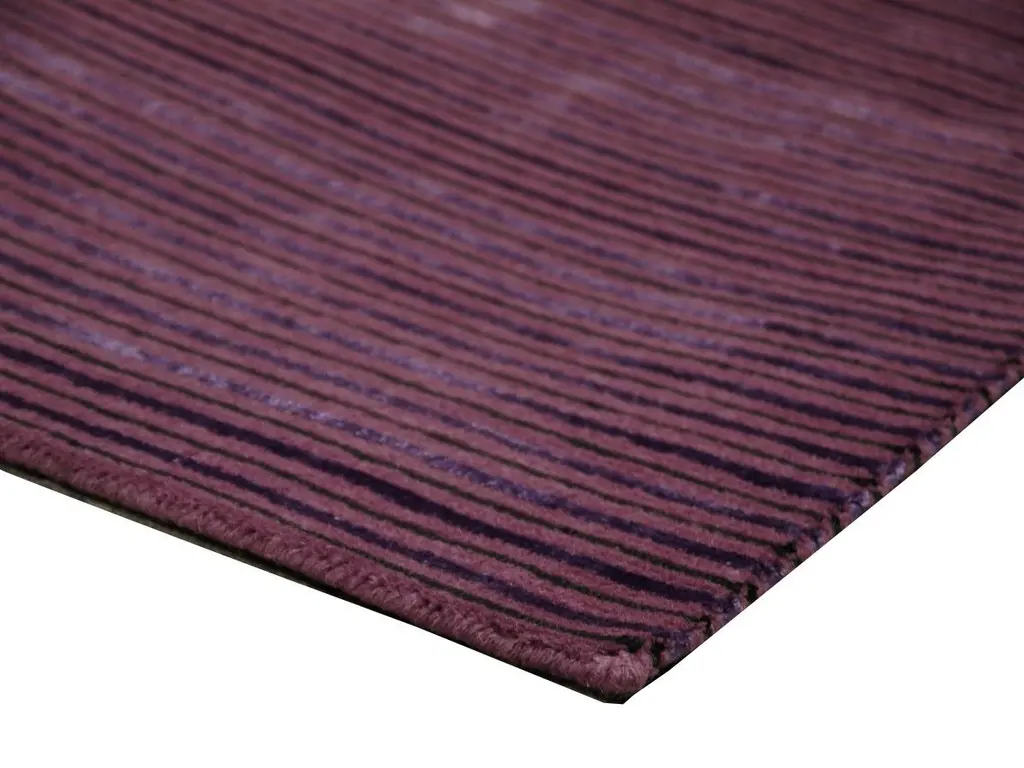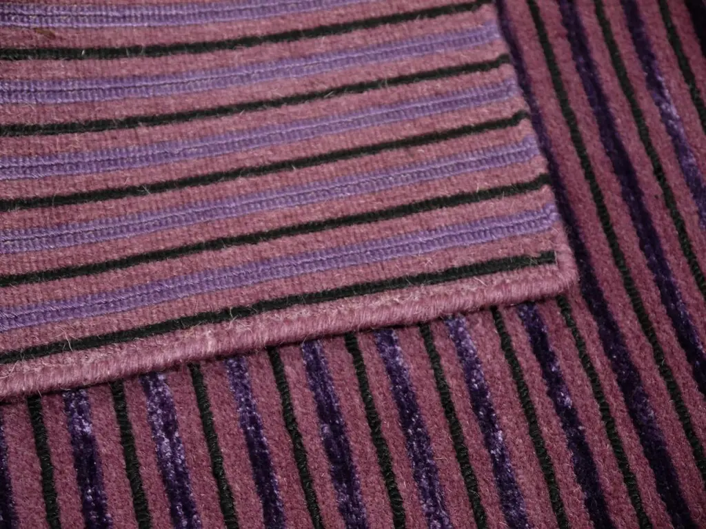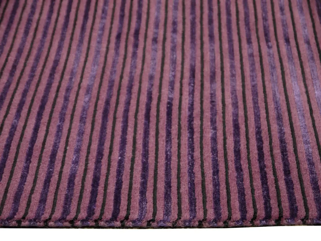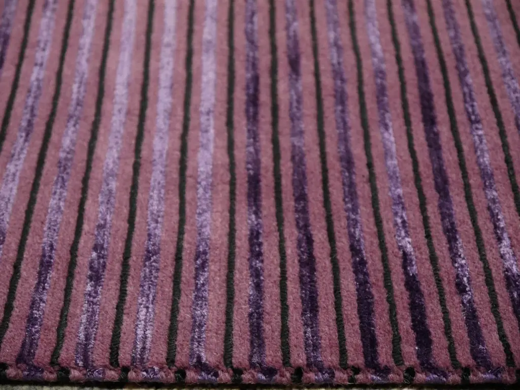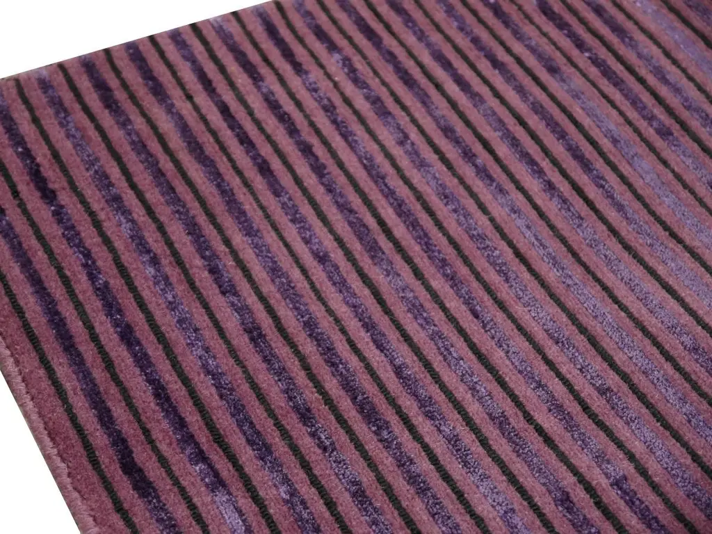 A beautiful contemporary modern design rug, hand knotted using finest wool bamboo silk in 3 x 2 ft / 90 x 60 cm.By Djoharian Design.Striped design rug hand-knotted in silk lilac variations.Striped rugs newer go out of style. In our contemporary colors they even look much better. We are offering the following standard sizes, delivery 3 - 4 month after confirmed order:5 x 3 ft, 6 x 4 ft, 7 x 5 ft, 7 x 7 ft, 8 x 8 ft, 8 x 6 ft, 9 x 6 ft, 10 x 8 ft, 11 x 8 ft, 9 x 12 ft, 10 x 14 ft.Our collection of luxurious carpets in the style of Stripe! are made in Nepal, Kathmandu by excellent artisans. Our Collection includes various designs and color palettes.The yarns were spun by hand on a traditional spinning weel in order to achieve the incomparable appearance of these carpets.The feel is soft and cozy thanks to the use of the finest material. The rug is approx. 1/4-1/3 inch high.Cubistic design carpet hand knotted.Design: Stripe!Collection: Djoharian DesignColors: Variations of lilacPile: 2/3 Tibetan highland wool, 1/3 bamboo silkSize: Available to order in the desired size. Other color combinations are possible.Underfloor heating: SuitablePerfect for loft or Industrial modern rooms. Looks fantastic on modern exposed concrete floors as well.Interior designers and architects are welcome to have this rug custom made in any size and color combination from 1200 different shades. We work with Pantone and RAL color systems.The Djoharian Design Collection is located in Germany, all our rugs are shipped from there. We are licensed FAIR-TRADE partner of LABEL STEP FAIR TRADE CARPETS. Label STEP is the fair-trade non-profit organization committed to the wellbeing of weavers and workers in the handmade carpet industry.