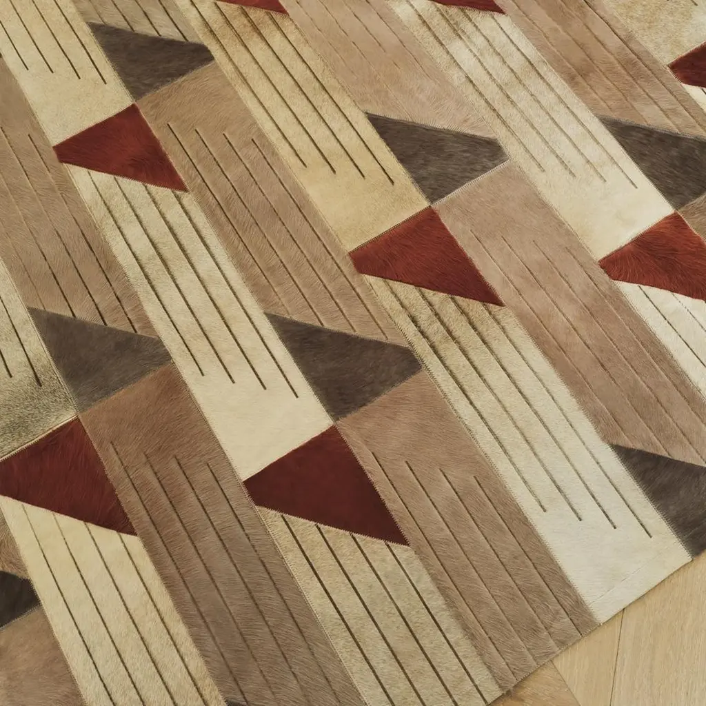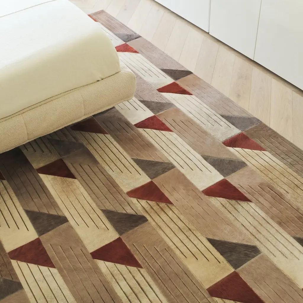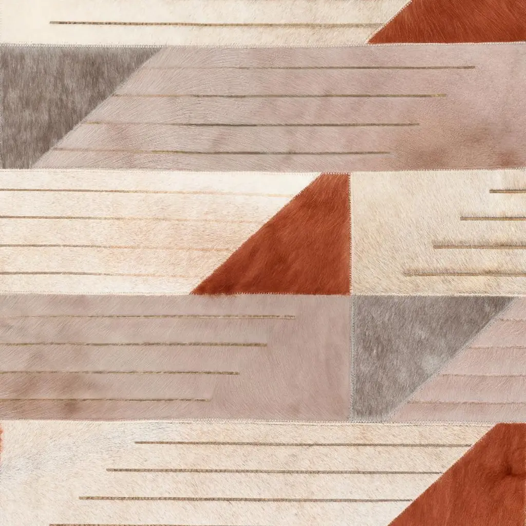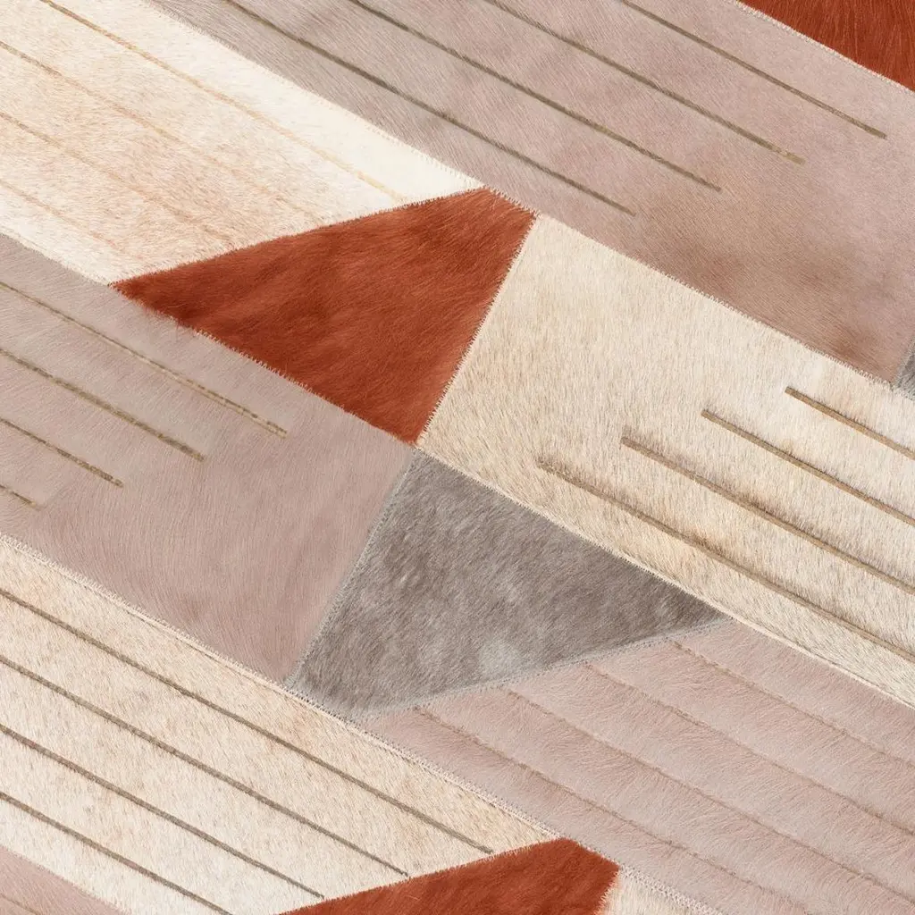 Cocorico combines the clean lines of modern architecture with the eccentric allure of the celebrity hotspot from which it gets its name. Whimsical with a touch of mid-century modern sensibility, the Cocorico rug is a timeless statement piece for any interior. The Cocorico palate features a lineal laser burn pattern on Cream and Mushroom colored hide, interspersed with triangles in Grey and Rust.Cocorico is stitched together using commercial grade nylon thread and features a branded ribbon edge finish. It can easily be customized to any colour, size or shape.The Altro Mondo Collection is a range of hide floor and wall coverings by Greg Natale for Art Hide. Classically stylish with an unconventional twist, Altro Mondo, meaning “other world” in Italian, is inspired by the innovative architecture and radical design ethos of famous Italian discotheques from the 1970s to the 1990s. Drawing from Brutalist, Postmodernist, and Space-Age aesthetics, the collection evokes the bold spirit embodied by these otherworldly spaces. Art Hide rugs are made to order. Please allow 4-6 weeks for delivery.