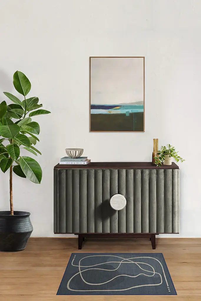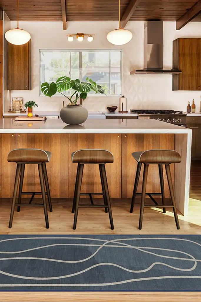 Tranquil and modern, our Strova Dusk Blue Rug is the perfect addition to any space. This stylish design features a thin and elegant ivory line that mimics the shape of an organic form sitting on bold shapes in a deep dusk blue. Water-resistant, stain-resistant, and machine-washable. Rug colors may vary slightly according to your device and the lighting in your space.