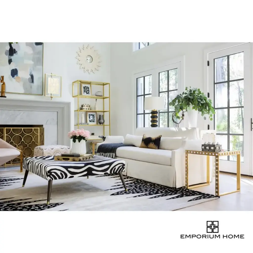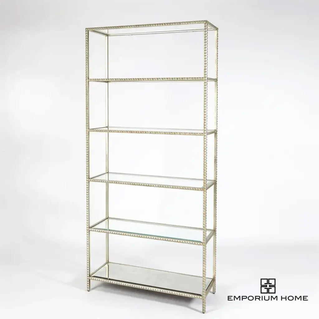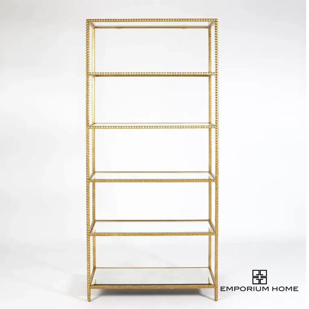 Our Stud Etagere brings the artistry of hand cast iron to a new level with a unique and on trend design element. Tiny pyramid studs line the entire frame of this design, all gleaming with a hand gilded gold leaf finish. Topped off with beveled glass shelves and an antique beveled mirror bottom shelf, this piece will add the perfect pop of rock and roll chic to any space. From a fashion forward perspective, Global Views offers accessories, furniture, statement lighting, and an assortment of rugs and mirrors to add beauty and joy to your home.