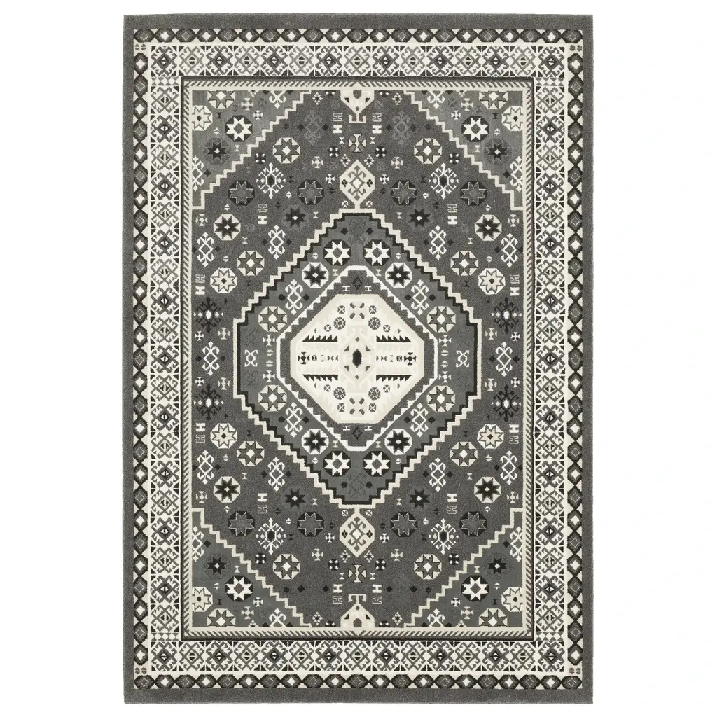 Create refined dimension in your space with the Ripley collection. These power-loomed rugs feature classic Persian, global, and geometric designs in contrasting black and ivory tones, along with soft blues, grays, and neutrals for added versatility.Features:Global influenced, traditional style indoor area rugTribal center medallion patternPower-loomed from a polypropylene and polyester blend with a woven polypropylene backingDimensional high low pile offers texture and dimensionFeatures shades of grey, ivory, black, beige, charcoalCleaning and Installation:If spills occur, blot as much of the stain as possible with a clean cloth. Use a small amount of mild soap and water to clean the area. If needed, rug and carpet cleaners that are safe for synthetic materials may be used. As with anything, use sparingly and in a small, inconspicuous area first to test results before applying to the entire rug. Blot dry with clean cloth. The use of a rug pad is recommended; initial creasing is normal, and these will generally fall out within a few days to a week; tightly reversing rolling the rug (pile side out) and leaving in warm area for several hours will aid in the removal of creases or lingering fold marks.Disclaimer:Due to the difference of monitor colors, some rug colors may vary slightly. We try to represent all rug colors as accurately as possible. All rug sizes are approximate. Sizes may vary +/- 1-3 inches due to weather, climate, and physical conditions at time of production and shipping.