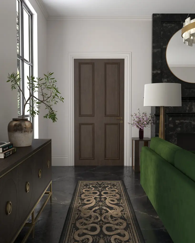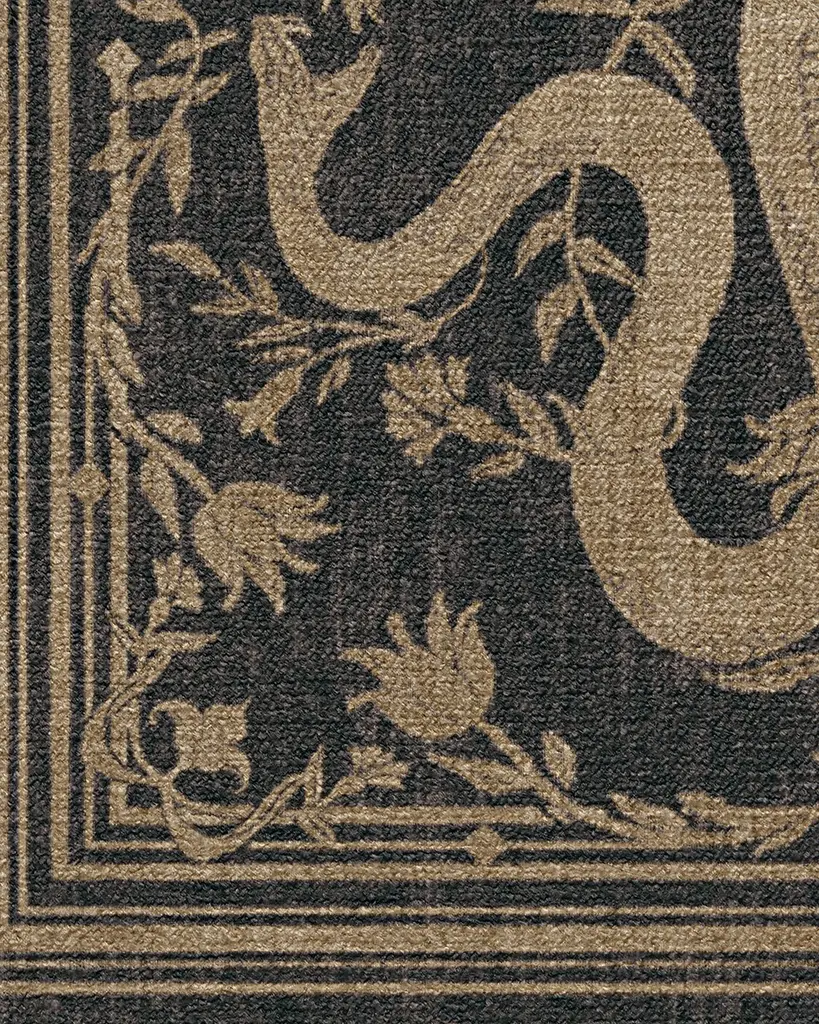 Watch stains slither away with our Martyn Lawrence Bullard Sumaya Soft Black Rug. Featuring bold and stylized mirrored snakes intertwining with intricate floral elements, this symmetrical design is complemented by a simple yet elegant decorative border. Variants of beiges and golds stand out beautifully against a deep black charcoal ground, creating a striking contrast. Water-resistant, stain-resistant, and machine-washable. Rug colors may vary slightly according to your device and the lighting in your space.