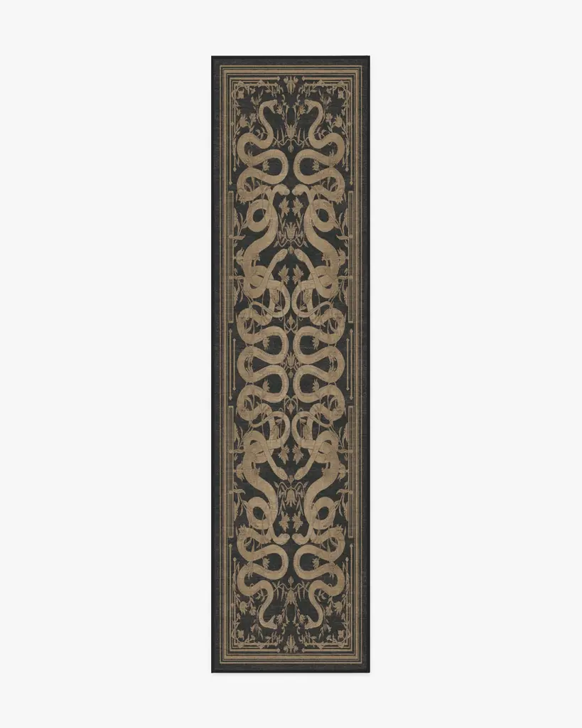 Watch stains slither away with our Martyn Lawrence Bullard Sumaya Soft Black Rug. Featuring bold and stylized mirrored snakes intertwining with intricate floral elements, this symmetrical design is complemented by a simple yet elegant decorative border. Variants of beiges and golds stand out beautifully against a deep black charcoal ground, creating a striking contrast. Water-resistant, stain-resistant, and machine-washable. Rug colors may vary slightly according to your device and the lighting in your space.