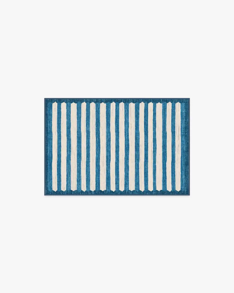 A bold take on stripes. Our Sumi Sailor Stripe Navy Rug intertwines warm navy and inky blue stripes that alternate against a soft pearl background. Water-resistant, stain-resistant, and machine-washable.
