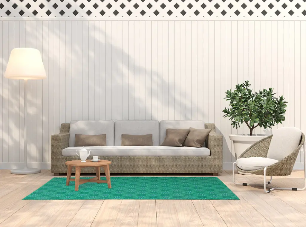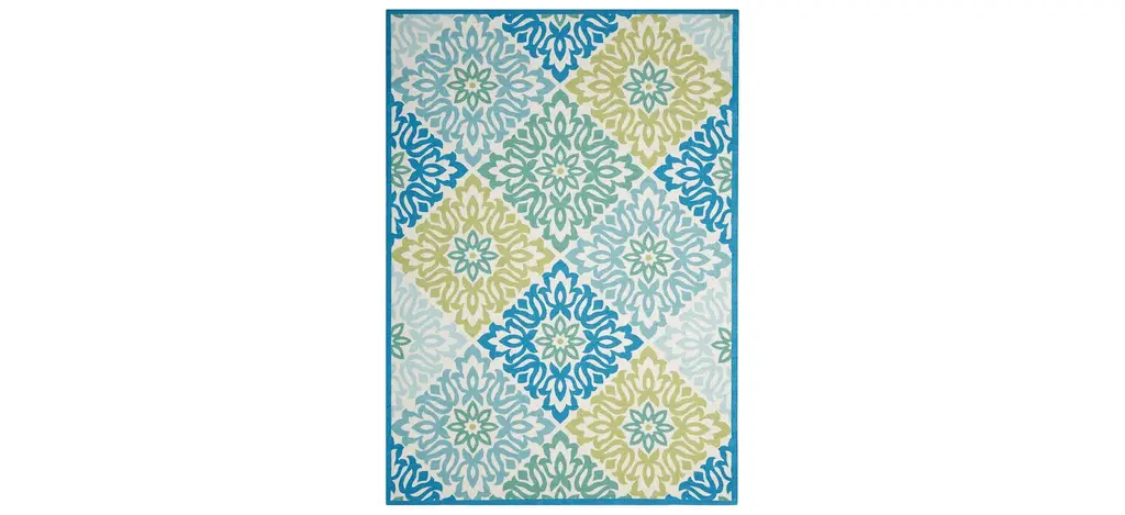 Bring a fun vibe into your home with a Sun Tile Indoor/outdoor Rug from our HH Revival Collection. Everyone will delight in the space defining design brought to your porch, patio, kitchen, or bathroom by this area rug. The artistic and colorful design is printed on a soft polyester base with a skid resistant backing, making it a perfect way to add color, flare and personality to any indoor or outdoor space. To clean, use a mild soap and lay flat to dry.