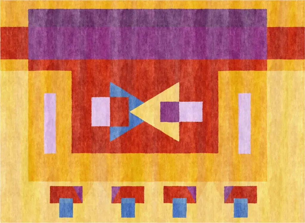 Sunrise 2 is a rectangular wool rug.Zollanvari Fine Gabbehs.The extensive use of geometrical and abstract patterns together with the vivid naturally dyed colours of Ghashgha’i weavings have analogies with the studies and learnings of the Bauhaus movement, in particular, with one of its key masters, Josef Albers. He studied in depth the interaction of colour and human perception. His paintings and artworks with squares reminded the designers of this collection of the geometries of Gabbeh carpets and the colour interaction between the single elements woven into them. In Albers’s universe, colour seduced, beguiled, swindled, and these characteristics made colour the most fascinating of art’s formal elements. This concept is at the very heart of this new collection. SoFar SoNear, Milan, designed this collection choosing iconic Ghashgha’i motifs that they simplified using squares and triangles. The lion, the peacock, woman and man are the motifs they drew upon merging the style of Gabbehs with the drawings of Albers.