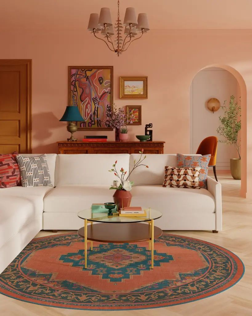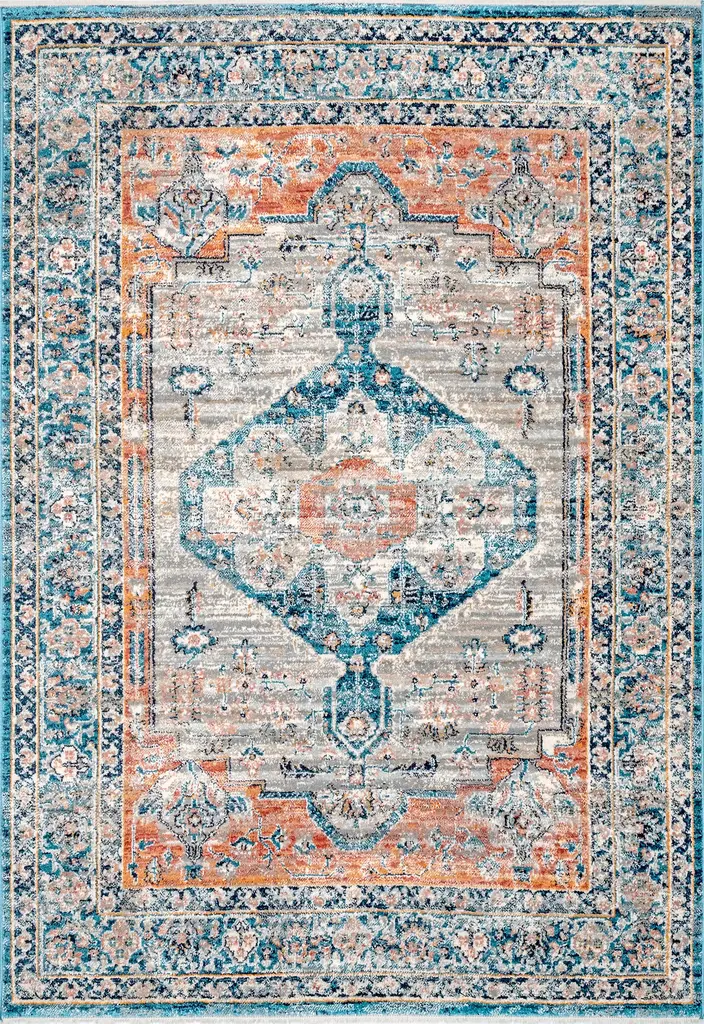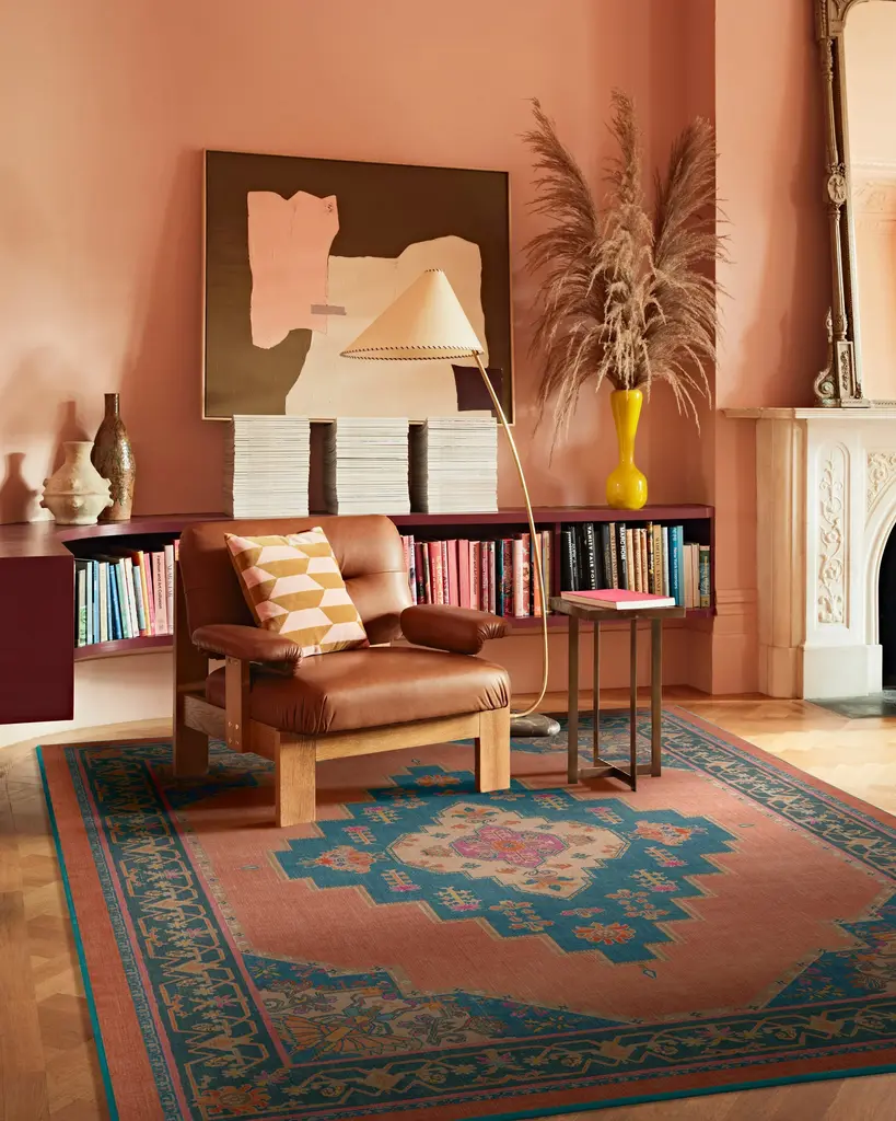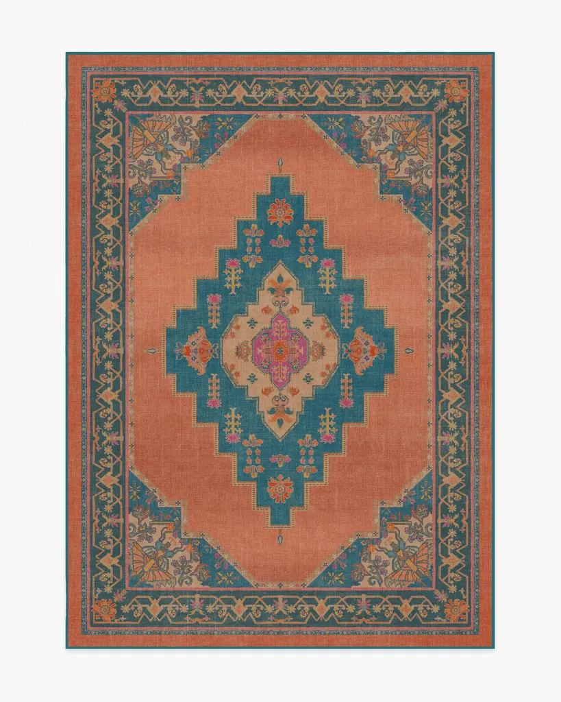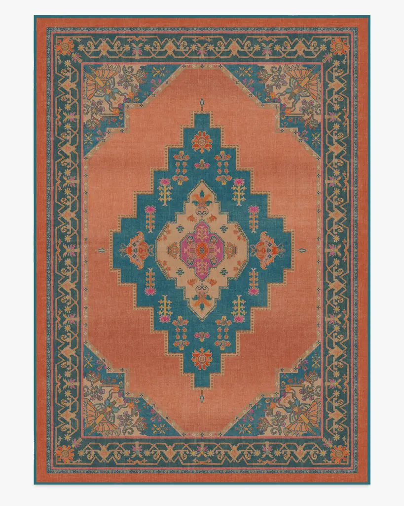 Bring global exploration right into your home with our Matthew Williamson Sunset Bazaar Rug. Inspired by textiles Matthew found in Spain and Morocco, this design features a large-scale medallion, subtle leopard print, and palm tree motifs. The striking teal medallion and border stand out against a vivid rust background, while pops of magenta, coral, and bright yellows add a lively contrast. Water-resistant, stain-resistant, and machine-washable. Rug colors may vary slightly according to your device and the lighting in your space.