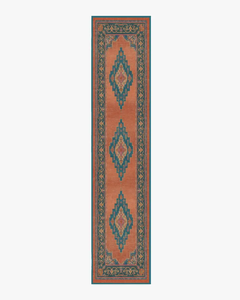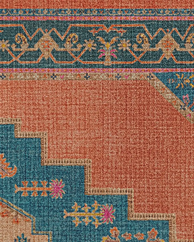 Bring global exploration right into your home with our Matthew Williamson Sunset Bazaar Rug. Inspired by textiles Matthew found in Spain and Morocco, this design features a large-scale medallion, subtle leopard print, and palm tree motifs. The striking teal medallion and border stand out against a vivid rust background, while pops of magenta, coral, and bright yellows add a lively contrast. Water-resistant, stain-resistant, and machine-washable. Rug colors may vary slightly according to your device and the lighting in your space.