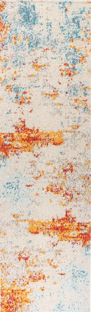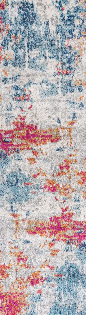 Inspired by the colors of an ocean sunset, this bold rug is modern art for your floor. Blues, reds and accents of gold splash and mingle in a random abstract design. This unique rug's overall pattern makes it perfect for homes with kids and pets. It's the perfect centerpiece for a mid-century modern, contemporary, or beach house.