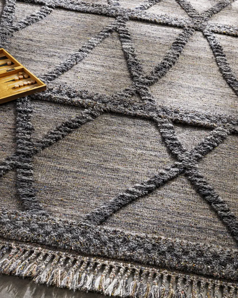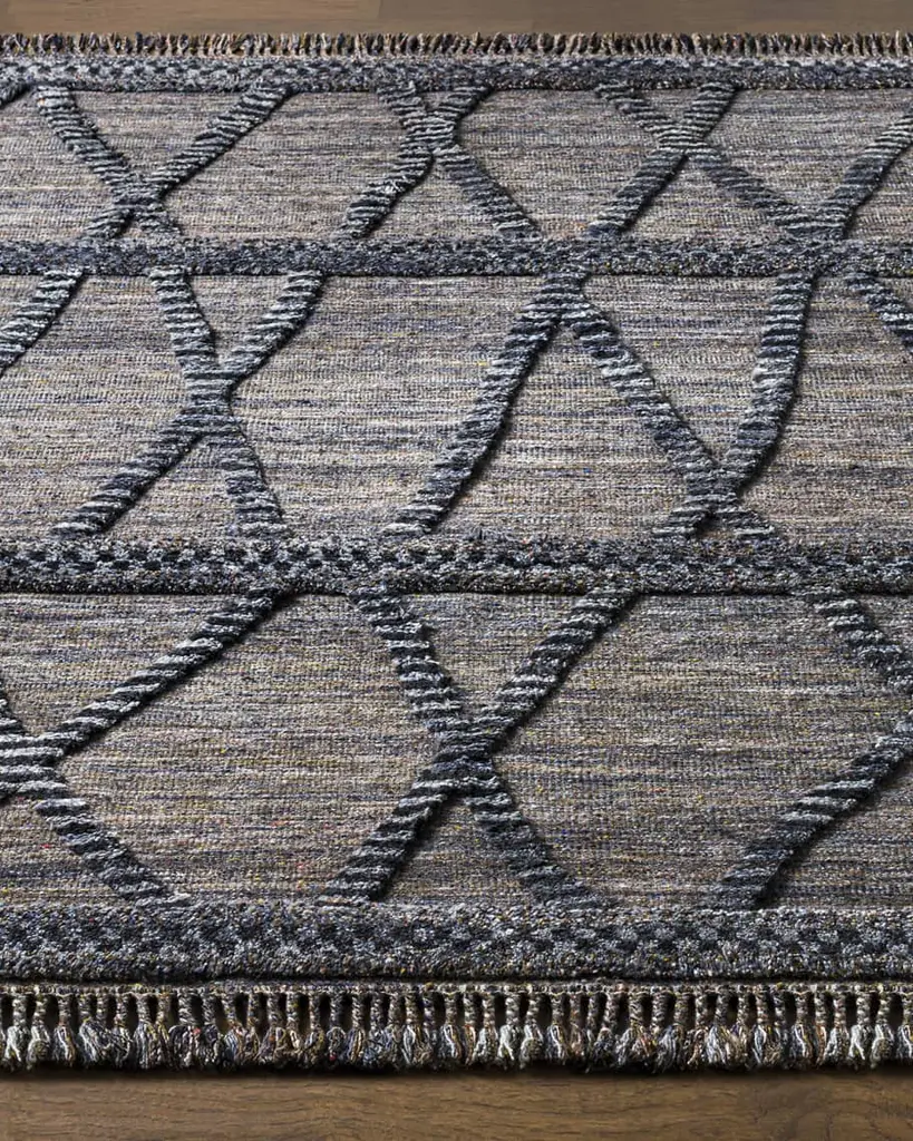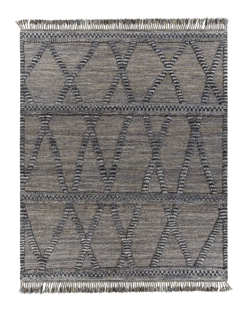 This rug features compelling global-inspired designs brimming with elegance and grace! the perfect addition for any home Handcrafted of wool with a high pile Thickness: 1.25" Fringe length: 5" Tassel detail, high/low Colors: black, gray, charcoal, dark brown, olive Item Weight (lbs.): 33 Vacuum regularly; professionally clean only Size is approximate; we recommend the use of a rug pad (not included) Imported Please note: Rugs (especially wool rugs) are prone to a natural shedding process. With regular vacuuming, the shedding will decrease over time. Hand-knotted rugs tend to shed less than hand-tufted rugs, and flatweave rugs will shed less than those with a deeper pile, but all rugs will shed more in high-traffic areas than they do in lower-traffic spaces.Unfortunately, we cannot provide rug swatches at this time. We apologize for the inconvenience. We recommend using a rug pad with every indoor rug to prolong its beauty by minimizing everyday wear and tear and providing a little breathing space to help prevent fiber damage. A pad also helps stabilize the rug, reducing slippage on hard floors. Shipping Direct from Vendor, usually ships within 120 business days. About Surya Rugs: Surya Rugs weaves a tapestry of style and sophistication in the world of floor coverings. With a commitment to innovation, it curates an extensive range of rugs that blend tradition with contemporary flair, enhancing spaces with color, texture, and timeless appeal. In 1976, a chance encounter in North India between a buyer from a major Department Store and Surya Tiwari led to the creation of Surya Rugs, which started out as a small supplier of hand-knotted rugs. Realizing that it was critical to have more direct contact with customers, Surya Tiwari established a division in the U.S. in 1986 and appointed his son, Satya, as president in 2006. With the goal of becoming the go-to resource for fashion-forward rugs and home furnishings, Satya has incrementally added new product categories to Surya's initial rug offerings. Like his father, Satya continues to push the boundaries of the home decor industry by continually investing in people, products, technology, and infrastructure to position customers for long-term success. Surya Rugs is obsessed with design details, driven to push the boundaries of color, pattern, texture and form. Its creative journey takes it to all corners of the globe to draw inspiration for beautiful products that will enhance the spaces they are placed in, today and for a lifetime.
