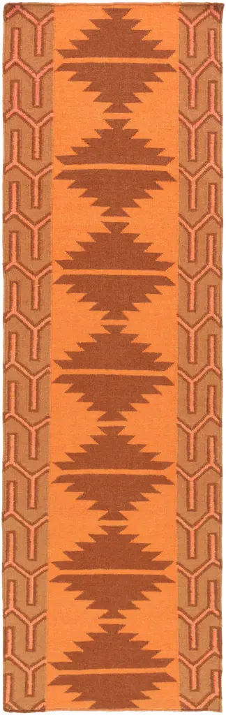 Collection: Swissvale Colors: Burnt Orange, Tan Construction: Hand Woven Material: Face: 100% Wool Pile: No Pile Styles: Southwestern Made In: India Thickness: 0.16" Price Range: $$$$$ (Affordable)