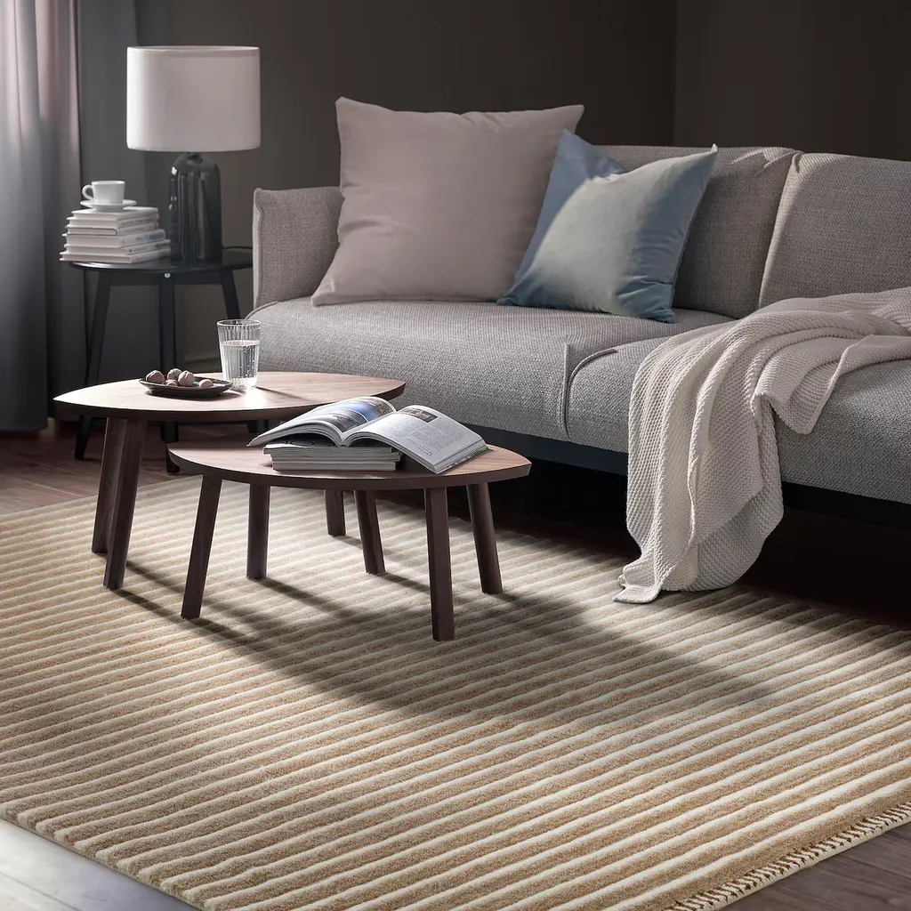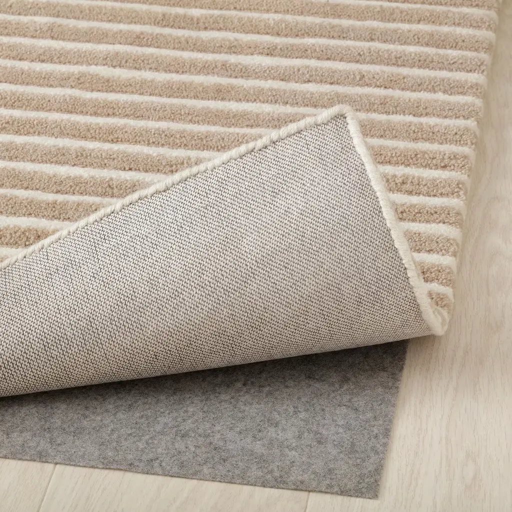 TÅGSPÅR Rug, high pile - white/beige 5 ' 7 "x7 ' 10 ". The mix of a high and low pile creates a 3D effect under your feet. The rug is made of wool so it’s naturally soil-repellent and very durable. A perfect companion for all types of flooring, even those with underfloor heating.