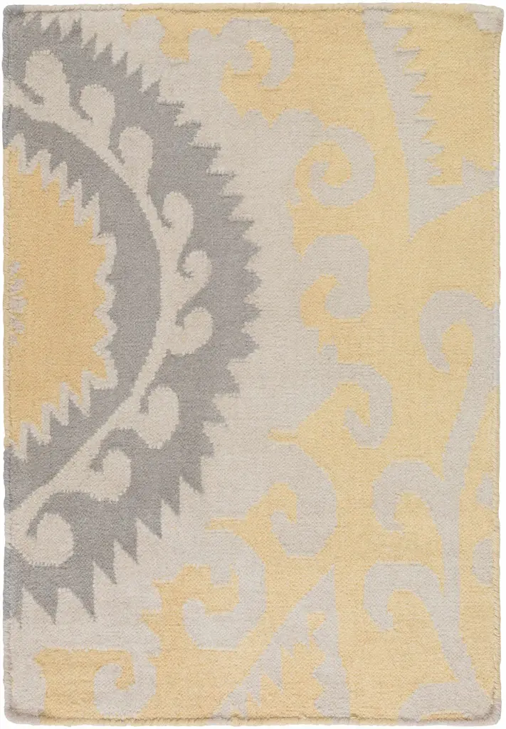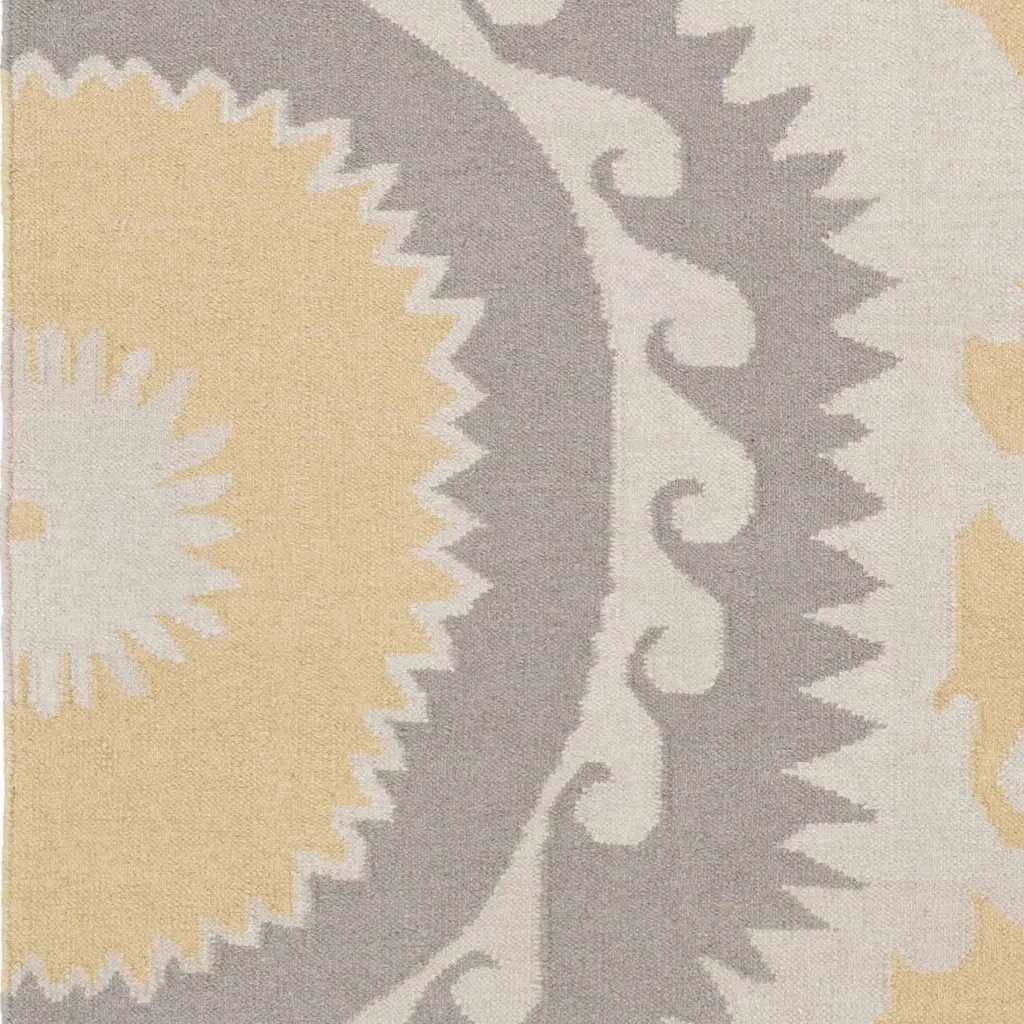 Collection: Tahawus Colors: Gray, Mustard, Taupe Construction: Hand Woven Material: Face: 100% Wool Pile: No Pile Styles: Transitional,Bohemian Made In: India Thickness: 0.16" Price Range: $$$$$ (Affordable)