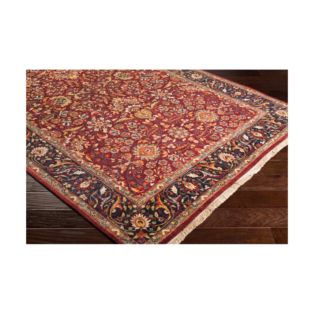 The Taj Mahal Collection showcases traditional inspired designs that exemplify timeless styles of elegance, comfort, and sophistication. With their hand knotted construction, these rugs provide a durability that can not be found in other handmade constructions, and boasts the ability to be thoroughly cleaned as it contains no chemicals that react to water, such as glue. Made with NZ Wool in India, and has Medium Pile. Spot Clean Only, One Year Limited Warranty.