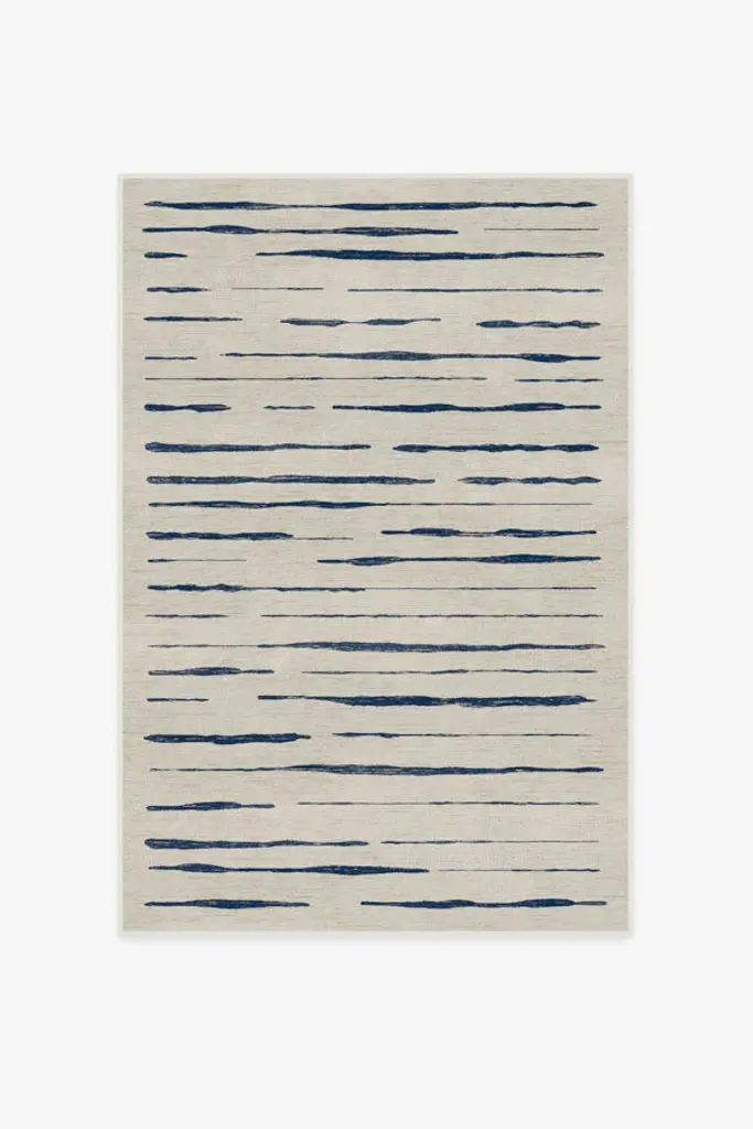 Nautical and chic, our Talas Stripe Indigo Rug features soft indigo stripes inspired by grooves found in coastal stones. This Mediterranean design brings a calming presence to any space with its warm pearl background. Water-resistant, stain-resistant, and machine-washable. Rug colors may vary slightly according to your device and the lighting in your space.