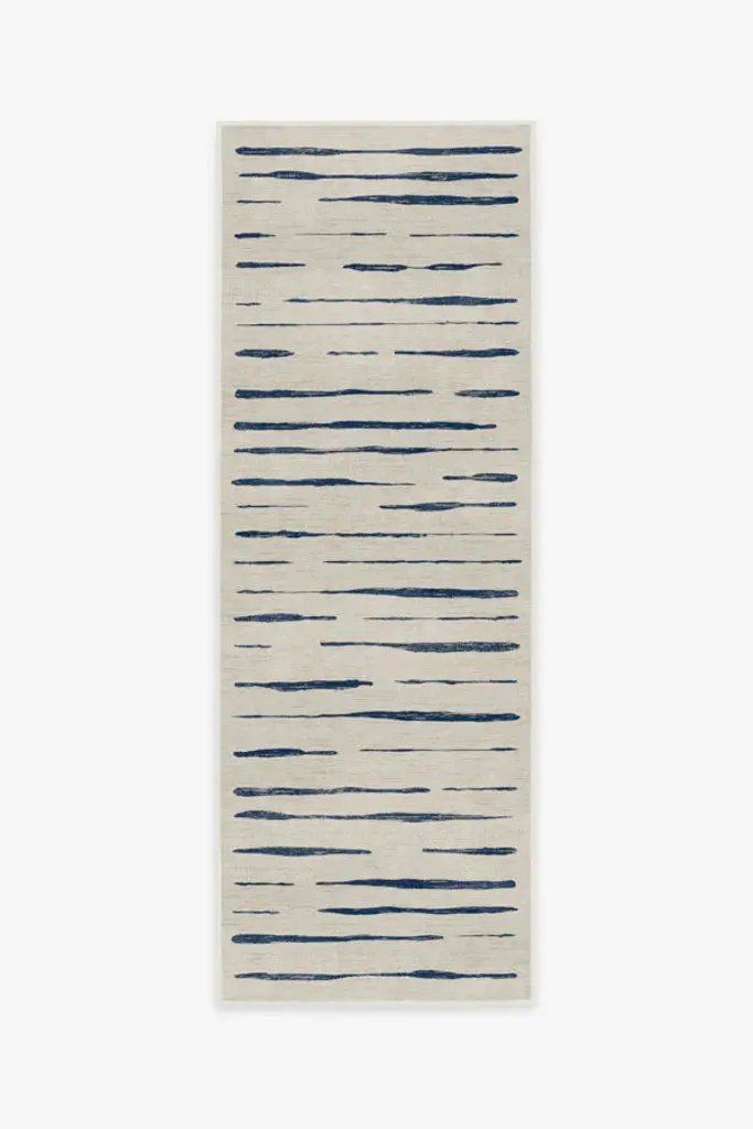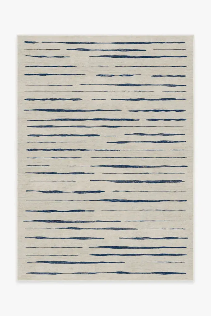 Nautical and chic, our Talas Stripe Indigo Rug features soft indigo stripes inspired by grooves found in coastal stones. This Mediterranean design brings a calming presence to any space with its warm pearl background. Water-resistant, stain-resistant, and machine-washable. Rug colors may vary slightly according to your device and the lighting in your space.