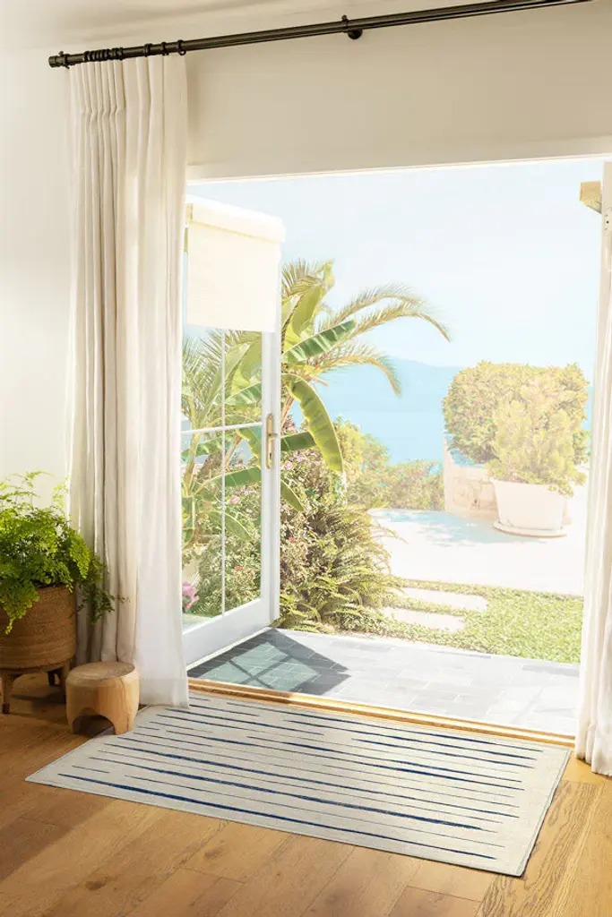 Nautical and chic, our Talas Stripe Indigo Rug features soft indigo stripes inspired by grooves found in coastal stones. This Mediterranean design brings a calming presence to any space with its warm pearl background. Water-resistant, stain-resistant, and machine-washable. Rug colors may vary slightly according to your device and the lighting in your space.