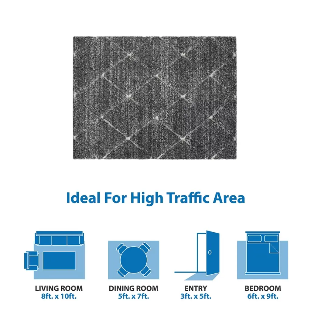Description Bring a soft and elegant touch to your home decor with the Madison Park Sophie Talas Shag Area Rug. This machine woven, plush rug features a super soft high pile with a grey and cream diamond trellis pattern for a modern and stylish update. Diamond pattern face detailing adds rich texture and an artisan touch, while a sprayed transparent latex reverse helps prevent the rug from sliding making it well suited for high traffic areas. Easy to clean with a brushless vacuum or by spot cleaning, while also stain and fade resistant - this shag area rug is the perfect update for a cozy yet fresh update. This shag area rug is OEKO-TEX certified, meaning it does not contain any harmful substances or chemicals to ensure quality comfort and wellness. Available in multiple colors and sizes, this rug is perfect for any living room, family room, and or other room decor. A rug pad is highly recommended to keep the rug more secured in place; Rug pad sold separately. Product Details 8x10' 1 Area Rug:8'W x 10'L Material 100% polypropylene