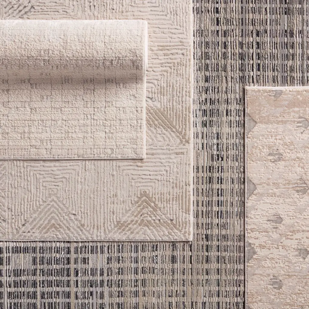 Edgy and statement-making, this shimmering rug features a texturally intriguing abstract design in a cream, silver, and gray color scheme. This power-loomed rug showcases brilliant metallic polyester fibers mixed with stain-resistant polypropylene for a lustrous and durable accent in any modern home.