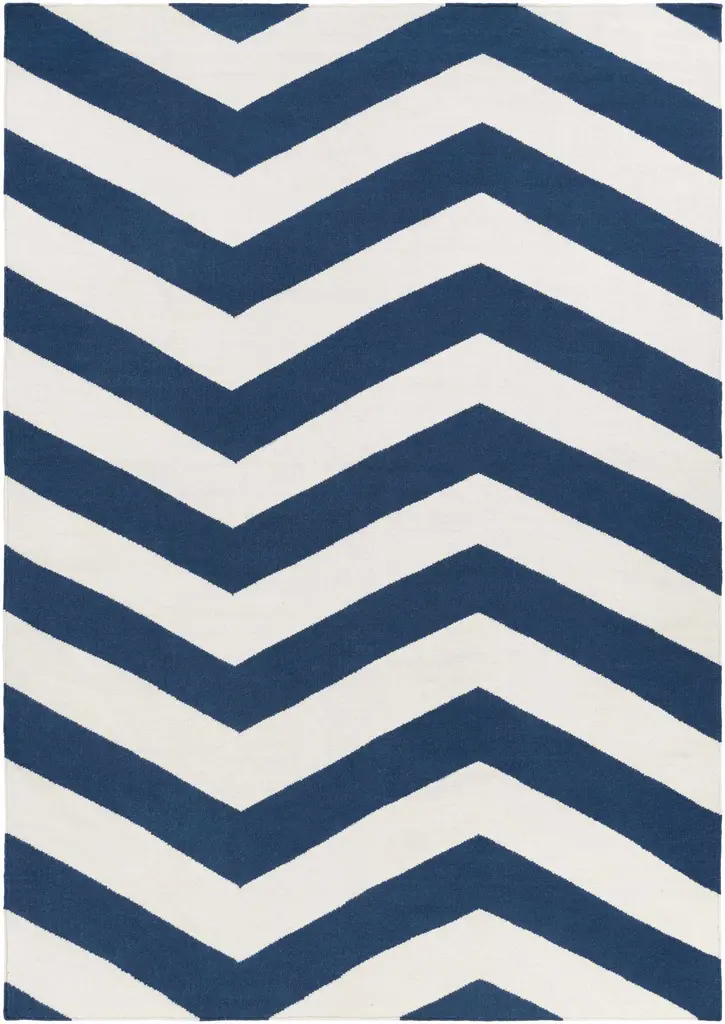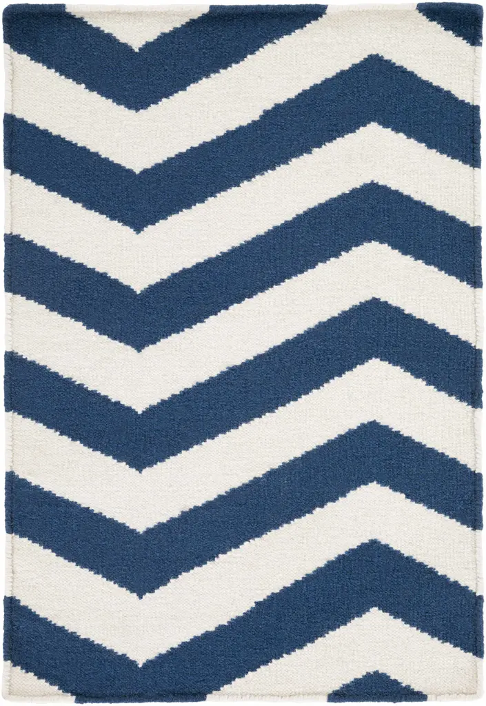 Collection: Tamaya Colors: White, Navy Construction: Hand Woven Material: 100% Wool Pile: No Pile Styles: Transitional Made In: India Thickness: 0.16" Price Range: $$$$$ (Affordable)