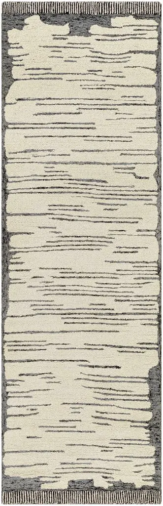 Collection: Tapas Colors: Black, Charcoal, Cream, Medium Gray Construction: Hand Tufted Material: 100% Wool Pile: Medium Pile Pile Height: 0.39" Styles: Transitional,Bohemian Backing: Canvas Made In: India Thickness: 0.59" Price Range: $$$$$ (Most Affordable)