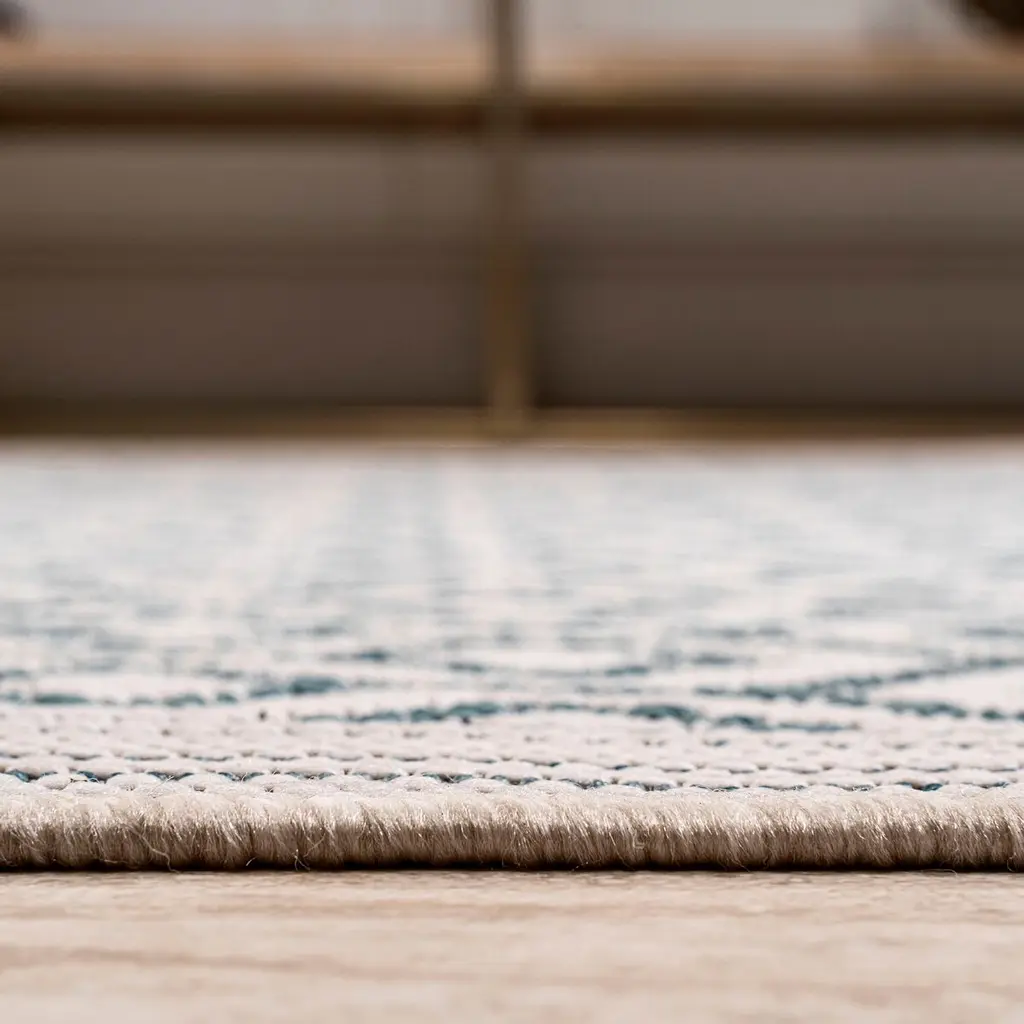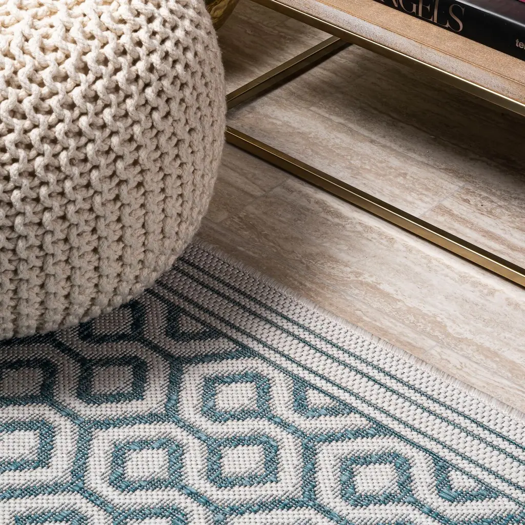 Mediterranean floor tiles inspired the geometric motif of this indoor/outdoor rug. Made of durable polypopylene, the rug can be hosed clean and will stand up to heavy traffic. A rug pad is recommended to help prevent slipping.