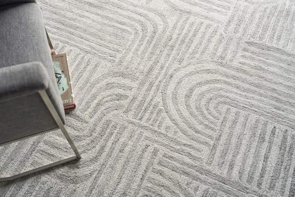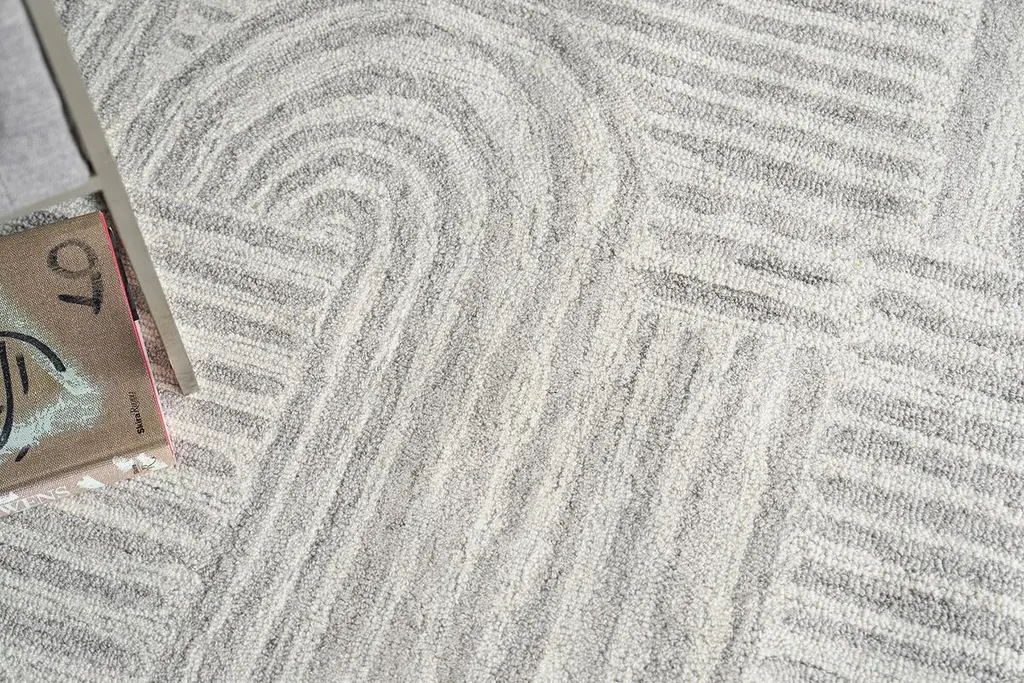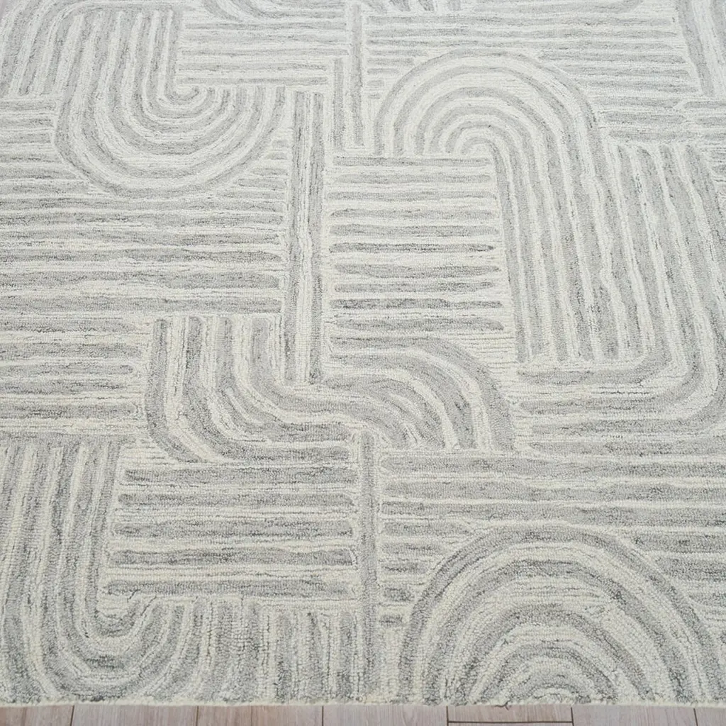 Tarpon is a hand-tufted 100% wool rug crafted in a dense loop pile. The design features a neutral foundation with contrasting elements, creating a classic modern pattern. Wool as the primary material offers warmth, durability, and a luxurious feel to the rug.